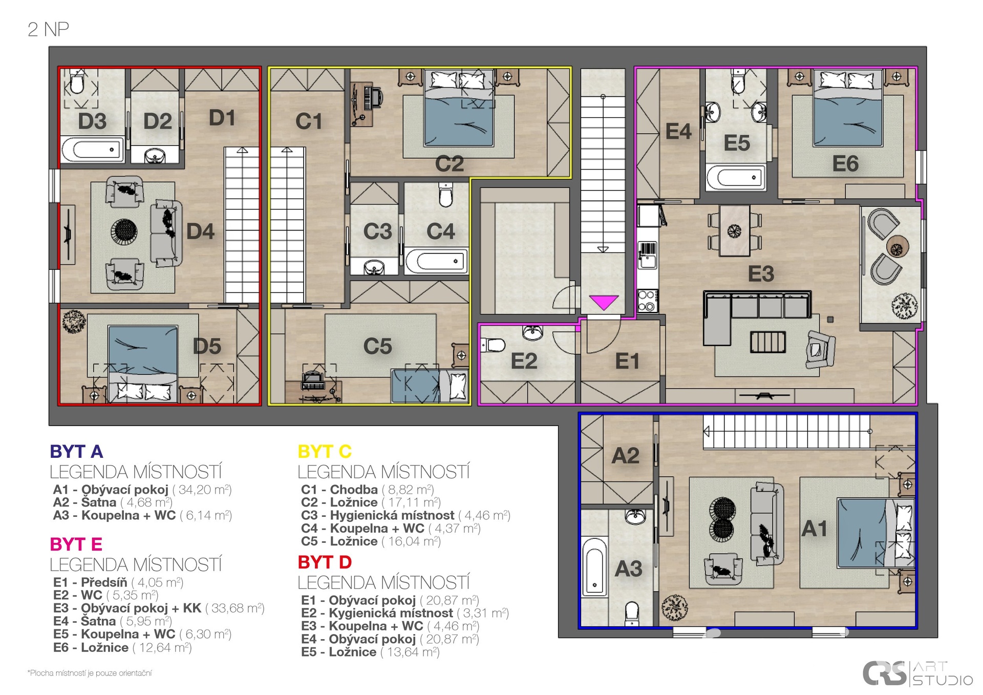 Projekt počítá s moderním dvoupodlažním domem o pěti komfortních jednotkách (2+kk a 3+kk, 54–99 m²), z nichž každá disponuje verandou nebo terasou s výhledem do zeleně. Dispozice lze upravit podle přání investora – ideální jak pro následný prodej apartmánů, tak pro provozování rekreačního pronájmu. Parkování je řešeno přímo u domu.