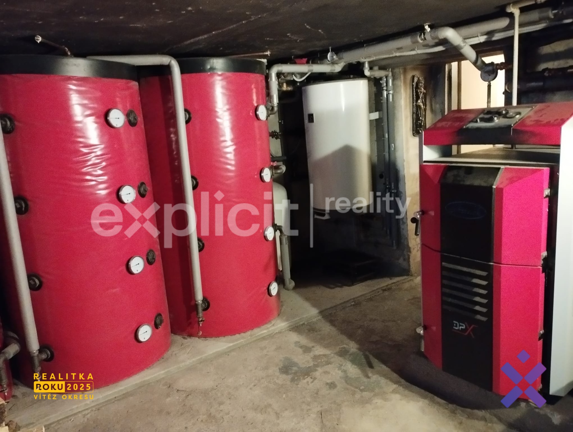 Velkým plusem domu je variabilní vytápění. K dispozici je plynový kotel i moderní kotel na dřevoplyn, napojený na tři akumulační zásobníky, které uchovávají teplo a postupně ho uvolňují do systému. Díky tomu stačí kotel roztopit jen jednou za několik dní, a dům zůstává příjemně vyhřátý. Celý systém dodala a instalovala firma Vestop. Na pozemku je navíc připravená zásoba paliva na celou topnou sezónu.
