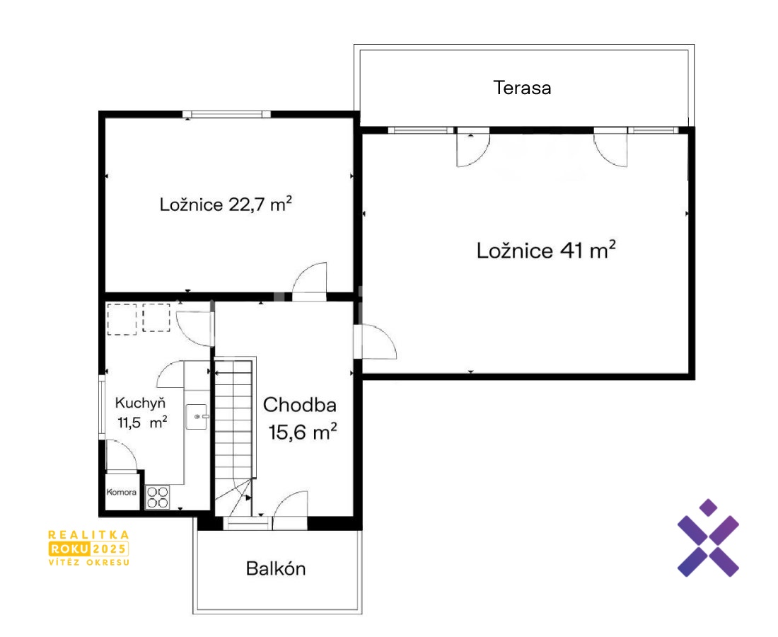 V patře jsou další dva pokoje a kuchyň. Prostor pro rodinu s dospělými dětmi, hosty nebo pro vybudování samostatné bytové jednotky. Jeden z pokojů má balkon, z chodby je vstup na zastřešenou terasu s výhledem do zahrady.