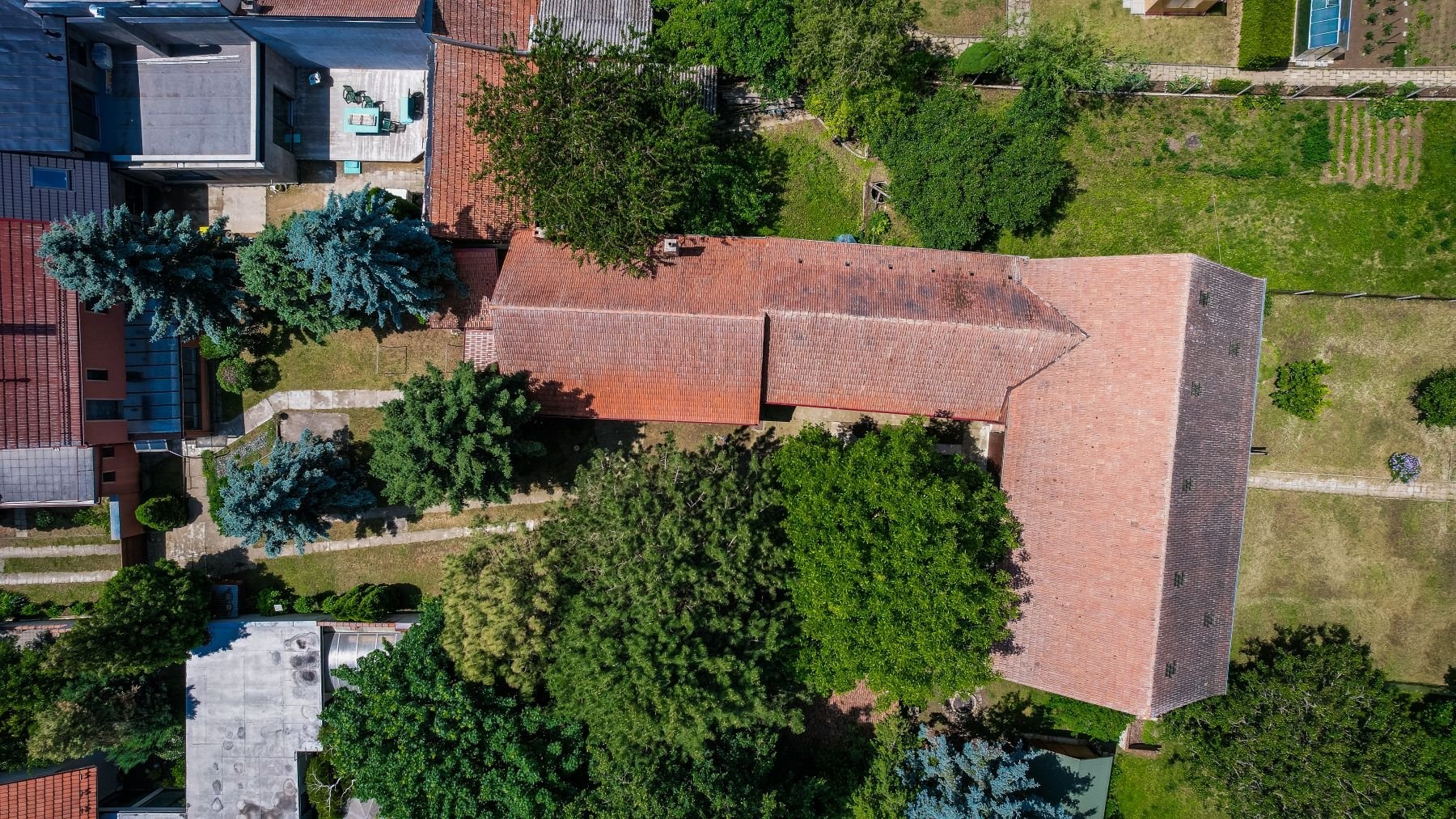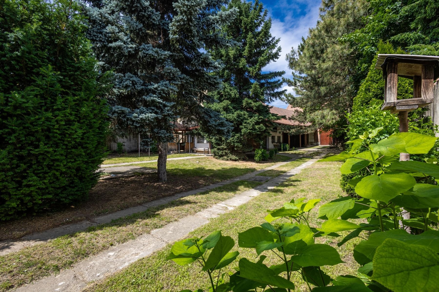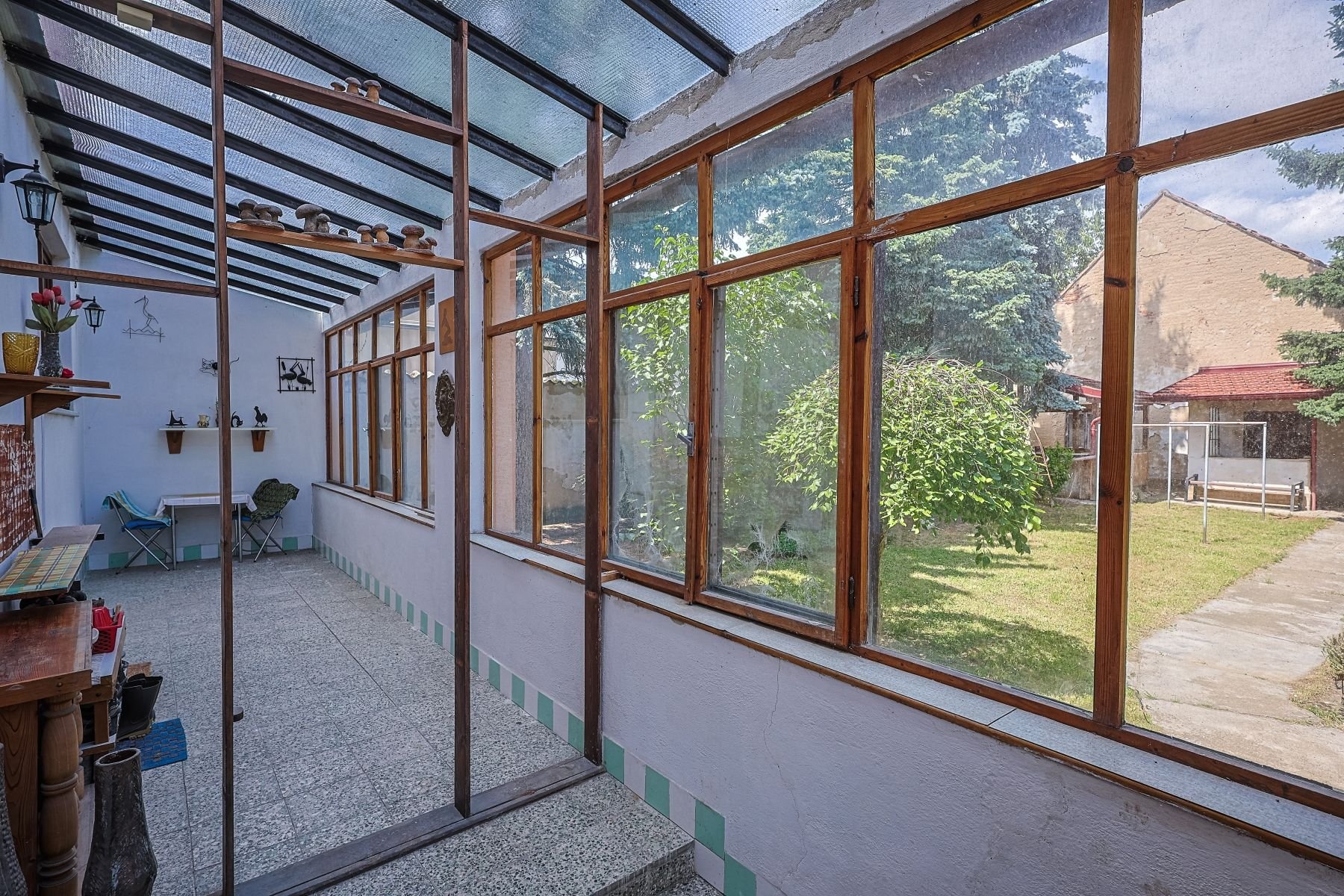Na dům v zadní části navazuje zastřešená terasa využitelná jako zimní zahrada. Následuje velká, pečlivě udržovaná zahrada se krásnými vzrostlými stromy. V této části pozemku jsou vybudovány dvě nádrže, vyčištěné nefunkční jímky, využitelné například ke zbudování bazénu. V zadní části pozemku jsou dále hospodářská stavení, dílny, garáže, sklepy a krásná čistá stodola.