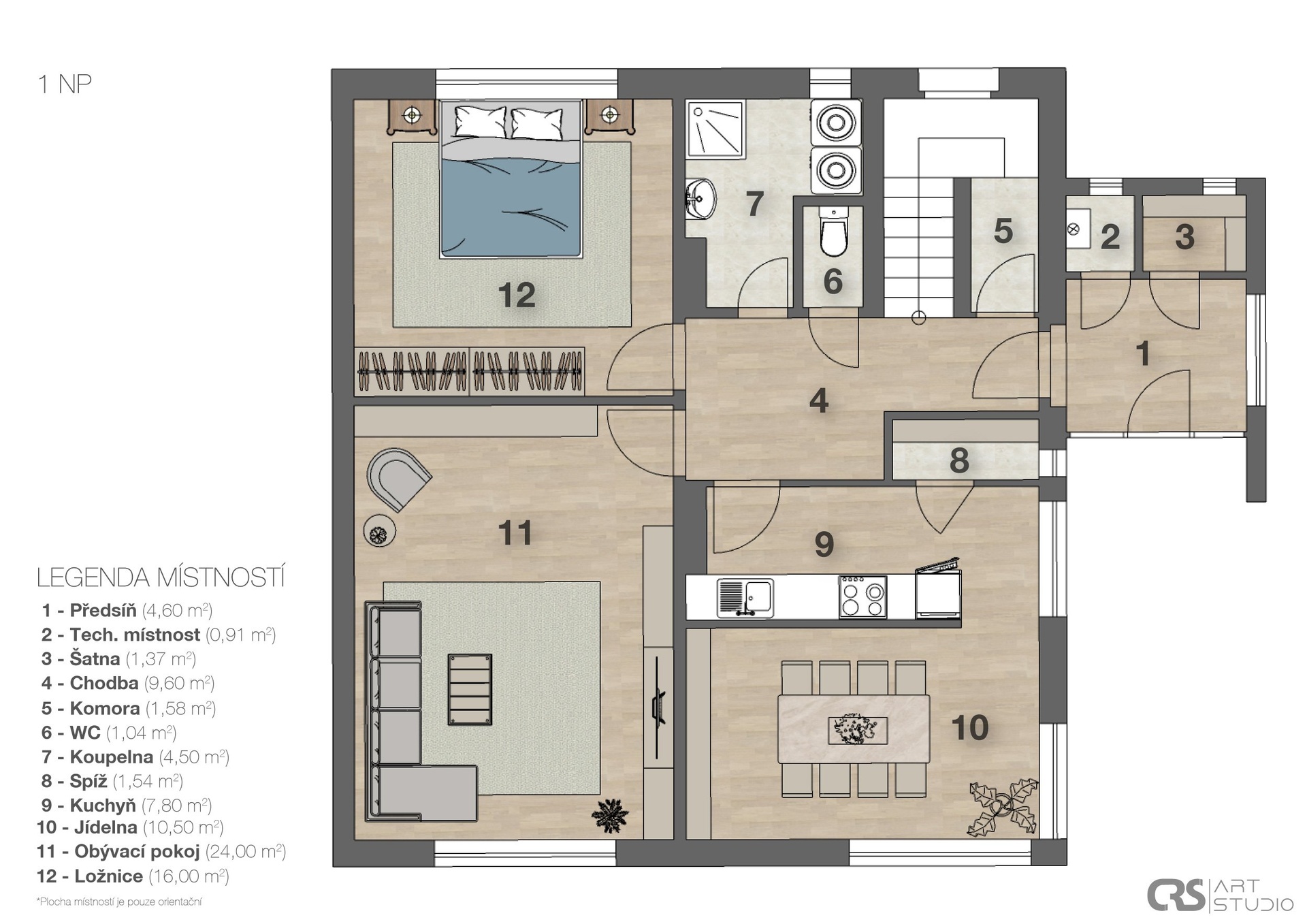 1.NP – zvýšené přízemí domu má dispozici 2+1 s velkou vstupní halou, a samostatnou koupelnou a wc. Výměra 83,5 m2. Schodiště v zadní části domu vede do sklepa a zároveň do 2. nadzemního podlaží.