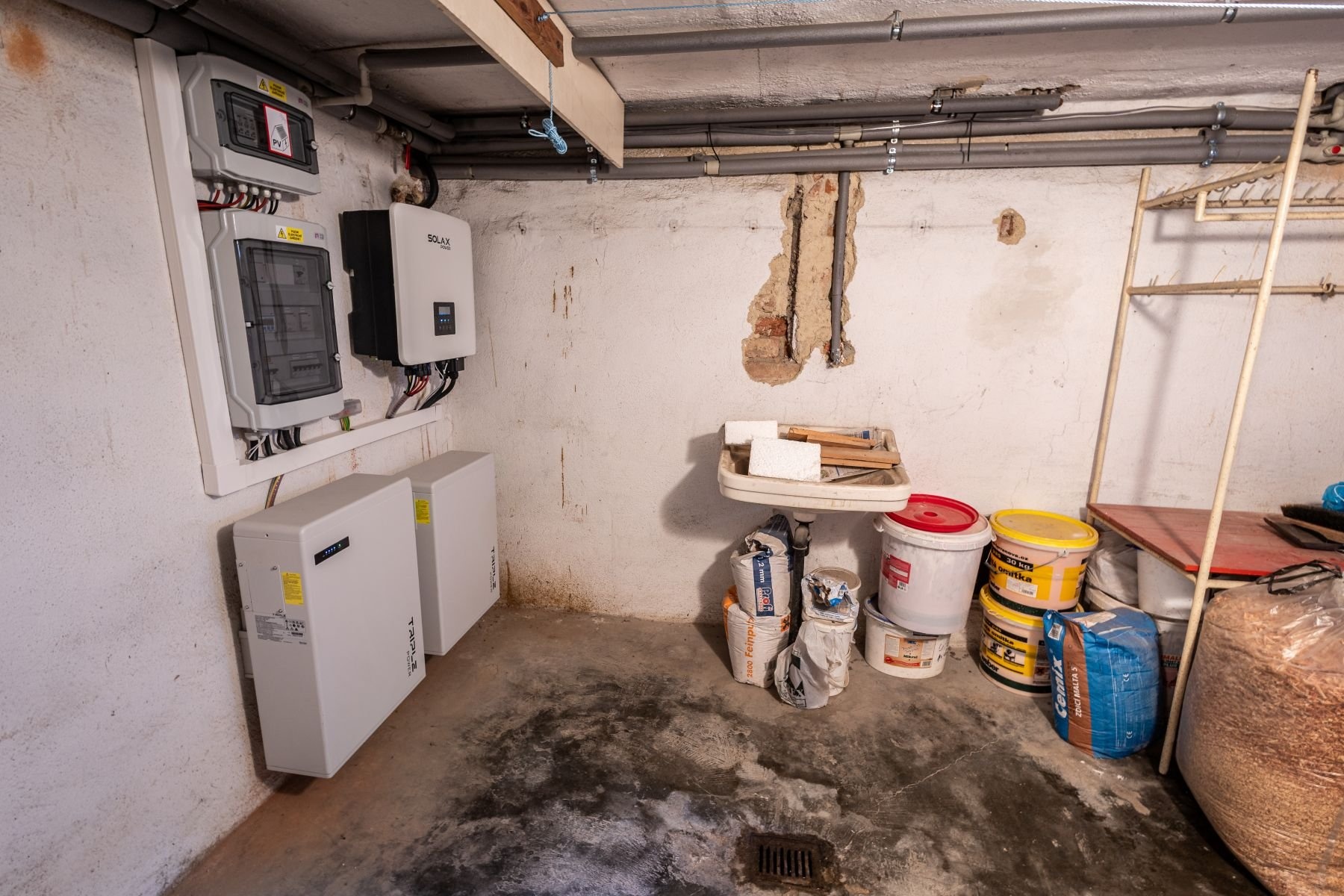 1.PP – sklepní prostory pod domem jsou rozděleny na místnosti a je zde také umístěno čerpadlo studny a kombinovaný kotel využívající plyn a solární energii z fotovoltaických panelů na střeše domu. Přebytky vyrobené energie jsou převáděny do elektrické sítě.