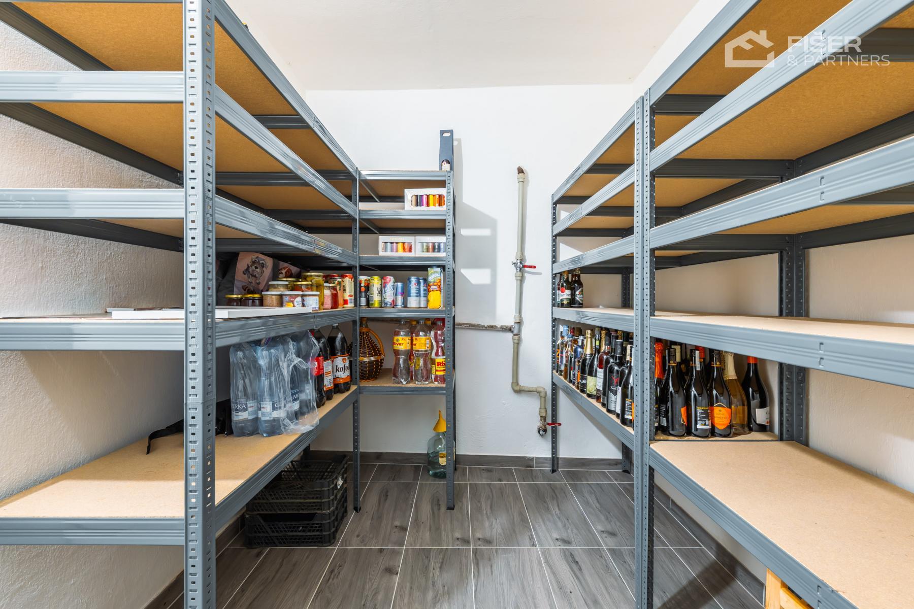 Interiér domu je logicky rozdělen tak, aby poskytoval dostatek soukromí všem členům domácnosti. Přízemí i patro nabízejí plnohodnotné dispozice, které lze využívat nezávisle na sobě. Srdcem pozemku o rozloze 800 m2 je kromě samotného domu také stylový zahradní domek, který není jen obyčejným skladem nářadí. Je vybaven vlastním barem a prostorem pro spaní, což z něj dělá ideální místo pro letní večery s přáteli nebo zázemí pro hosty. Parkování je vyřešeno prostornou garáží přímo v domě a dalšími parkovacími místy na vlastním pozemku před vstupem.