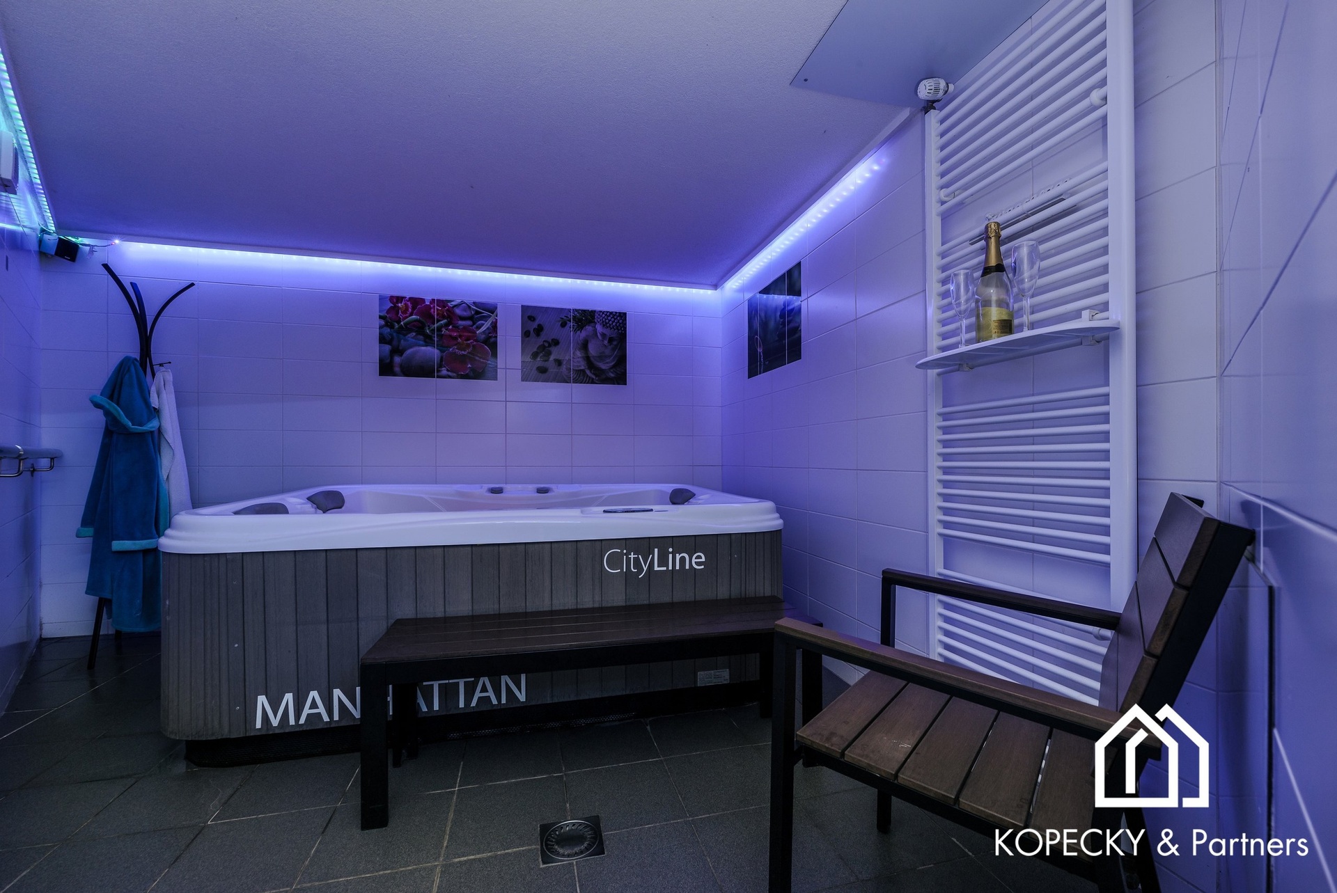 Nemovitost nabízí soukromé wellness s vířivkou a saunou pro dokonalou relaxaci. Venku se nachází vyhřívaný bazén s protiproudem, udržující teplotu na příjemných 30 °C, což umožňuje koupání po celý rok. Pro milovníky zimních sportů je na pozemku k dispozici lyžařský vlek ideální pro začátečníky.