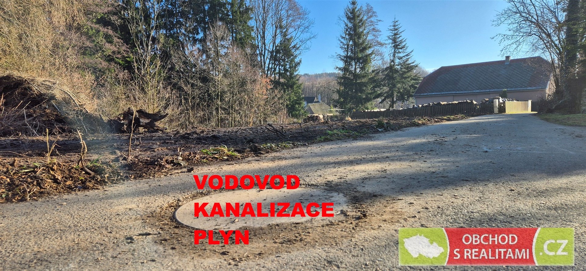 Pozemek je přístupný po obecní asfaltové komunikaci, ve které leží vodovod, kanalizace i plyn; přípojka elektřiny je zakončena v pilíři na pozemku.