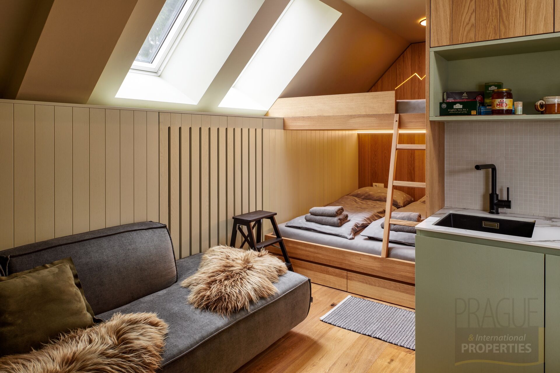 Apartmán je navržen s důrazem na každý detail – od kvalitních přírodních materiálů po stylové vybavení. Prosvětlený interiér s velkoformátovými okny se vstupem na balkon, kuchyňská linka plně vybavená spotřebiči (lednice, varná deska, mikrovlnná trouba, myčka), koupelna s prostorným sprchovým koutem a podlahovým vytápěním, obývací a spací zóna v harmonickém spojení, s kvalitní patrovou postelí a pohodlným posezením.