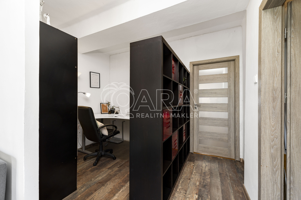 Byt prošel částečnou rekonstrukcí, při které byly provedeny úpravy zvyšující jeho praktičnost i komfort. Mezi obývacím pokojem a ložnicí vznikla díky sádrokartonové příčce samostatná pracovna, ideální například pro home office nebo jako menší pokoj. Další úpravou je vytvoření komory mezi chodbou a kuchyní, která nabízí vítaný úložný prostor.