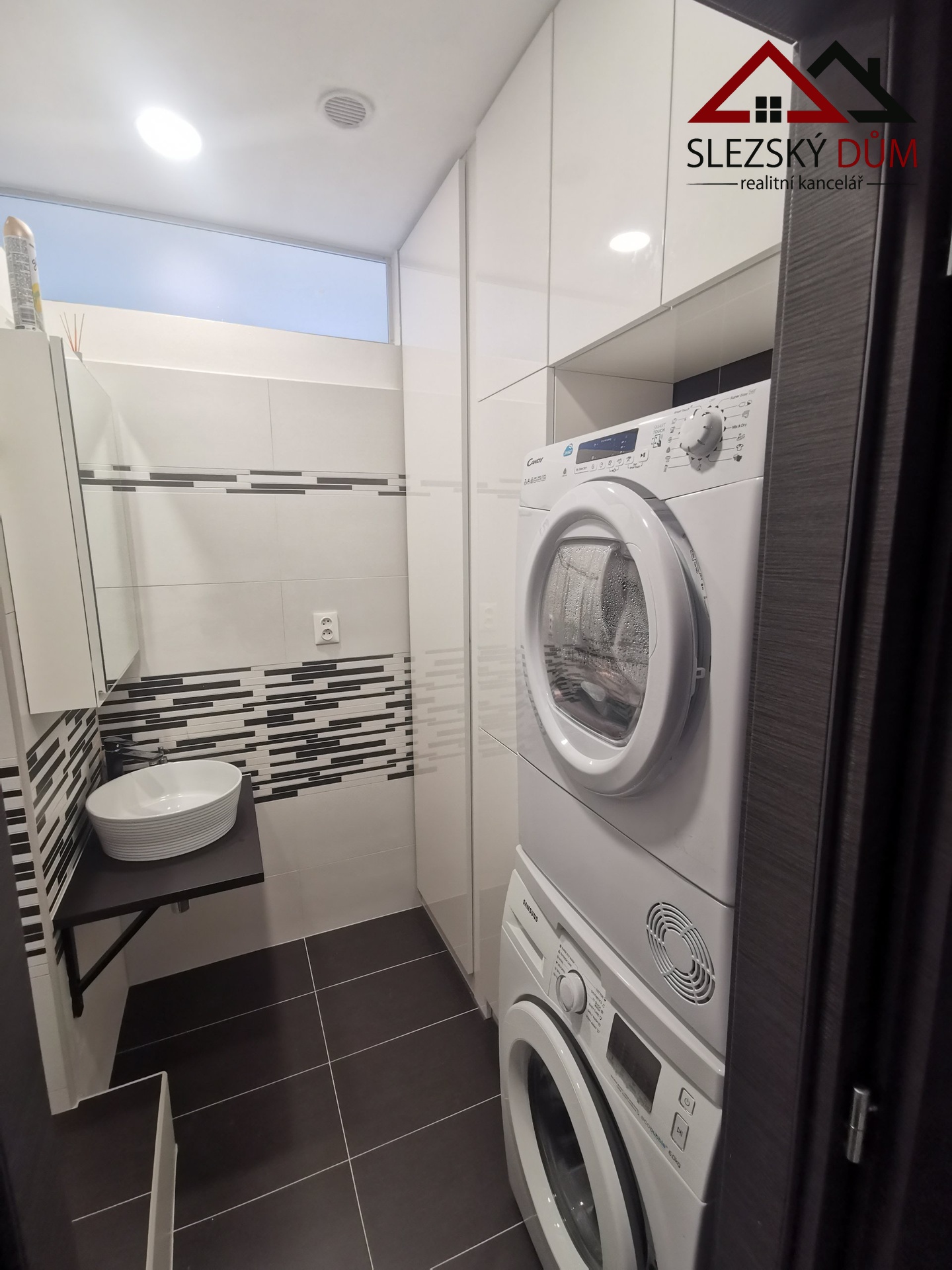 Kuchyň je řešená moderní linkou s indukční varnou deskou a vestavnou troubou. Koupelna je ve světlém, čistém provedení, na fotkách je vidět vana a prakticky řešený prostor pro pračku (případně i sušičku). WC je samostatné.