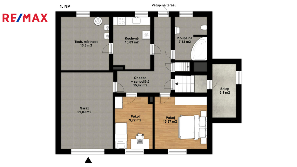 I.NP. - s podlahovou plochou 96 m2 tvoří prostorná garáž, technická místnost, kompletně vybavená letní kuchyně pro chvíle trávené u bazénu či zahradě, třetí koupelna s vanou a WC, dva pokoje, které se dají využívat jako pokoje pro hosty, pracovny, fitness, prostory pro podnikání, případně možnost vybudování sauny.