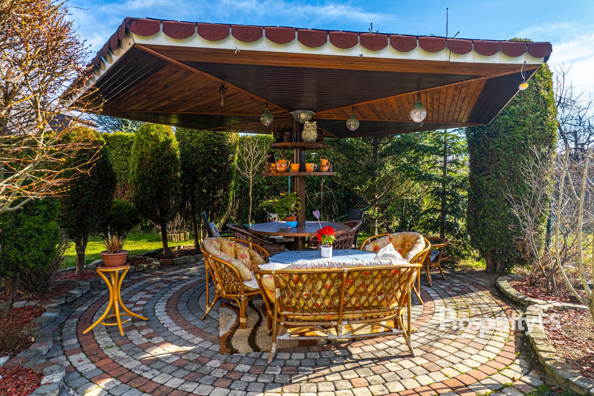 Zahrada o rozloze 800 m² je pečlivě udržovaná, doplněná o letní altán a praktickou spižírnu pro uskladnění ovoce a zeleniny.