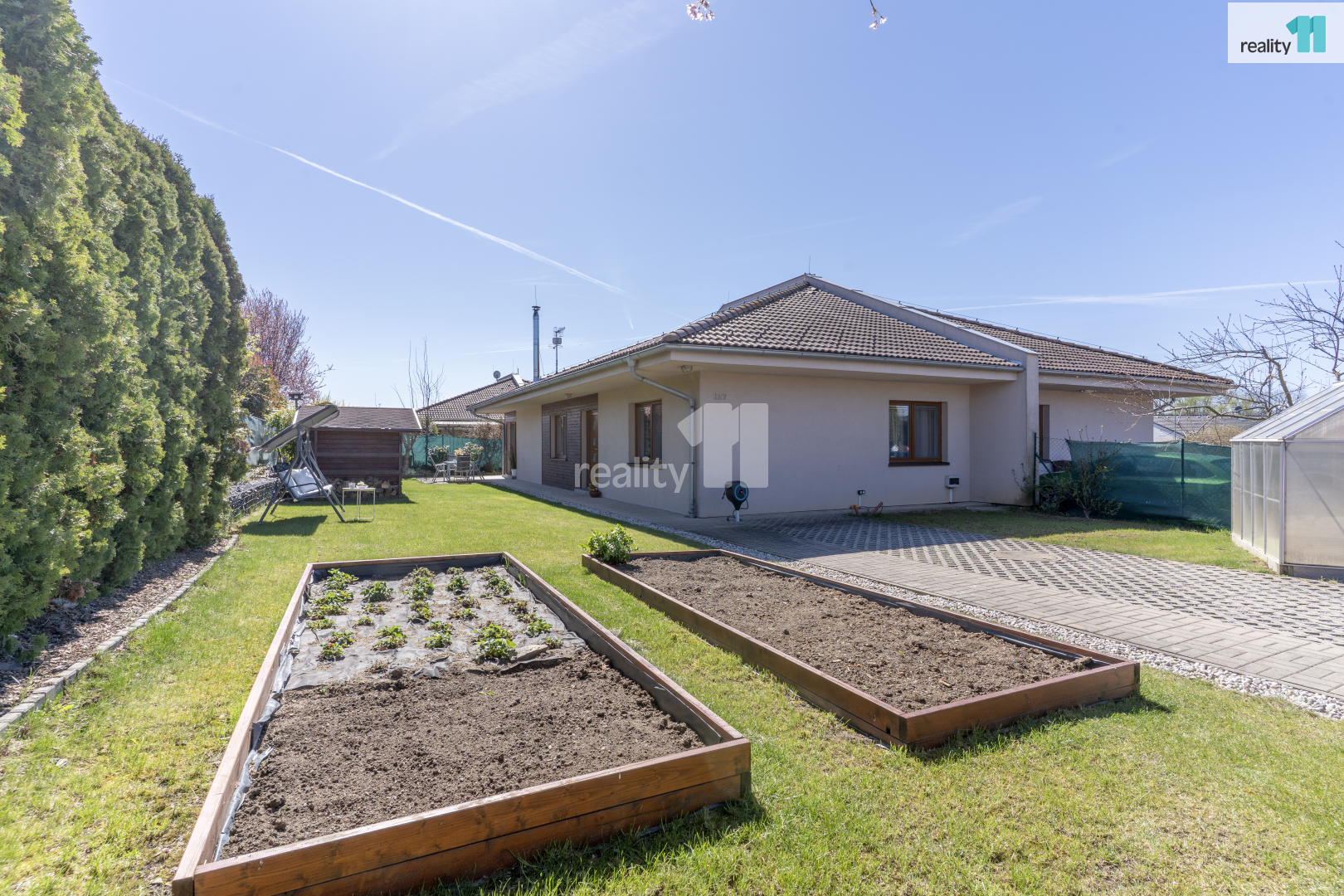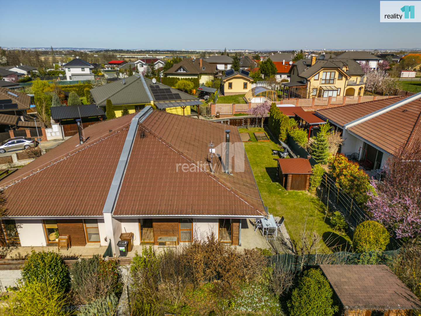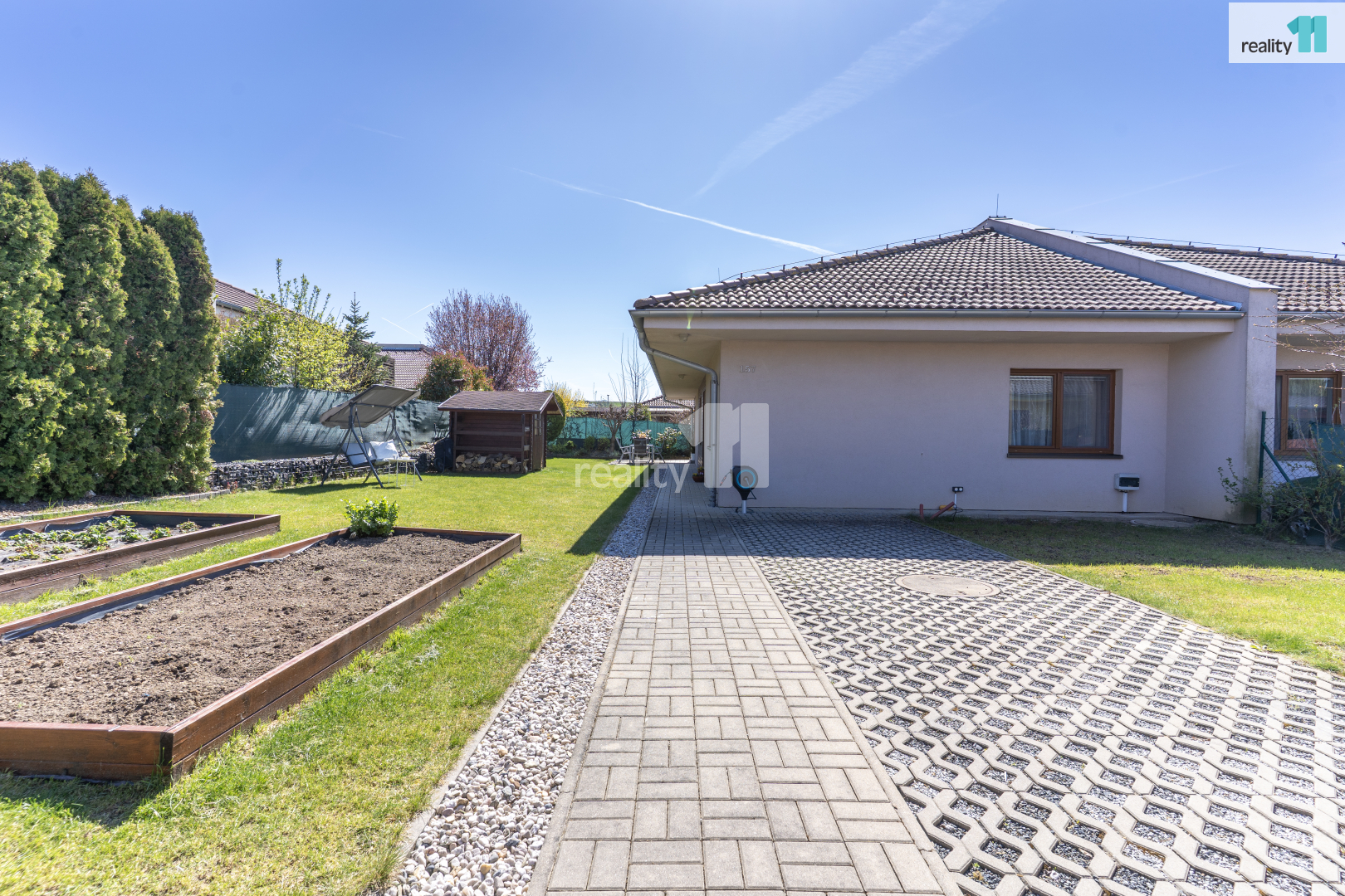 Užitná plocha domu činí přibližně 101 m² a je situován na pozemku o výměře 453 m². Dominantou interiéru je obývací pokoj s kuchyňským koutem a jídelní částí, odkud je zajištěn přímý vstup na terasu a do udržované zahrady. Ta poskytuje dostatek soukromí pro relaxaci, rodinné posezení i volnočasové aktivity. Součástí zahrady je také praktický zahradní domek pro uskladnění nářadí a sezónního vybavení.