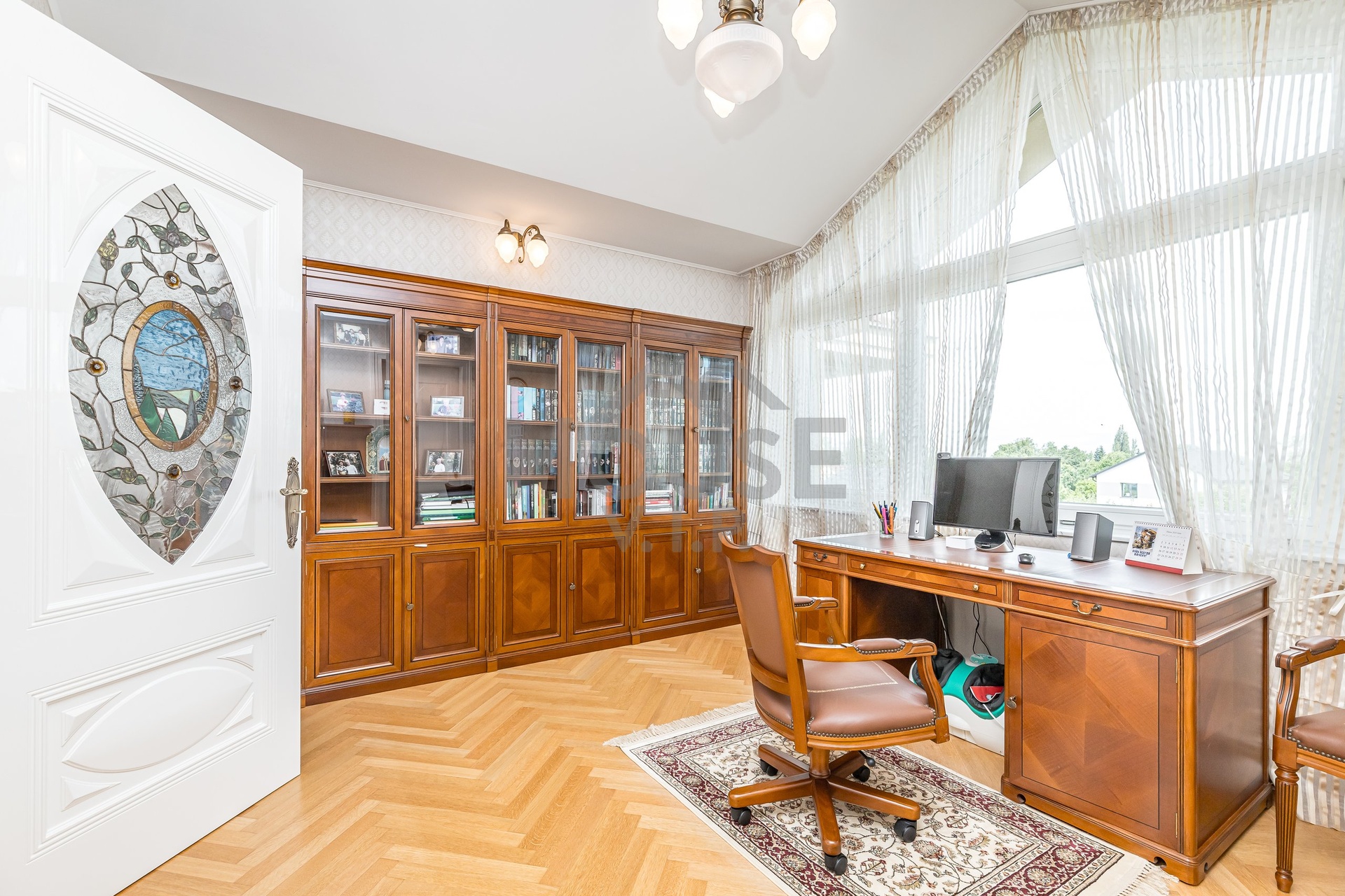 Dále se v patře nacházejí 2 velké zařízené ložnice, každá s vlastní koupelnou, a dobře vybavená pracovna s archivem, technické místnosti - žehlírna s úložnou skříní.