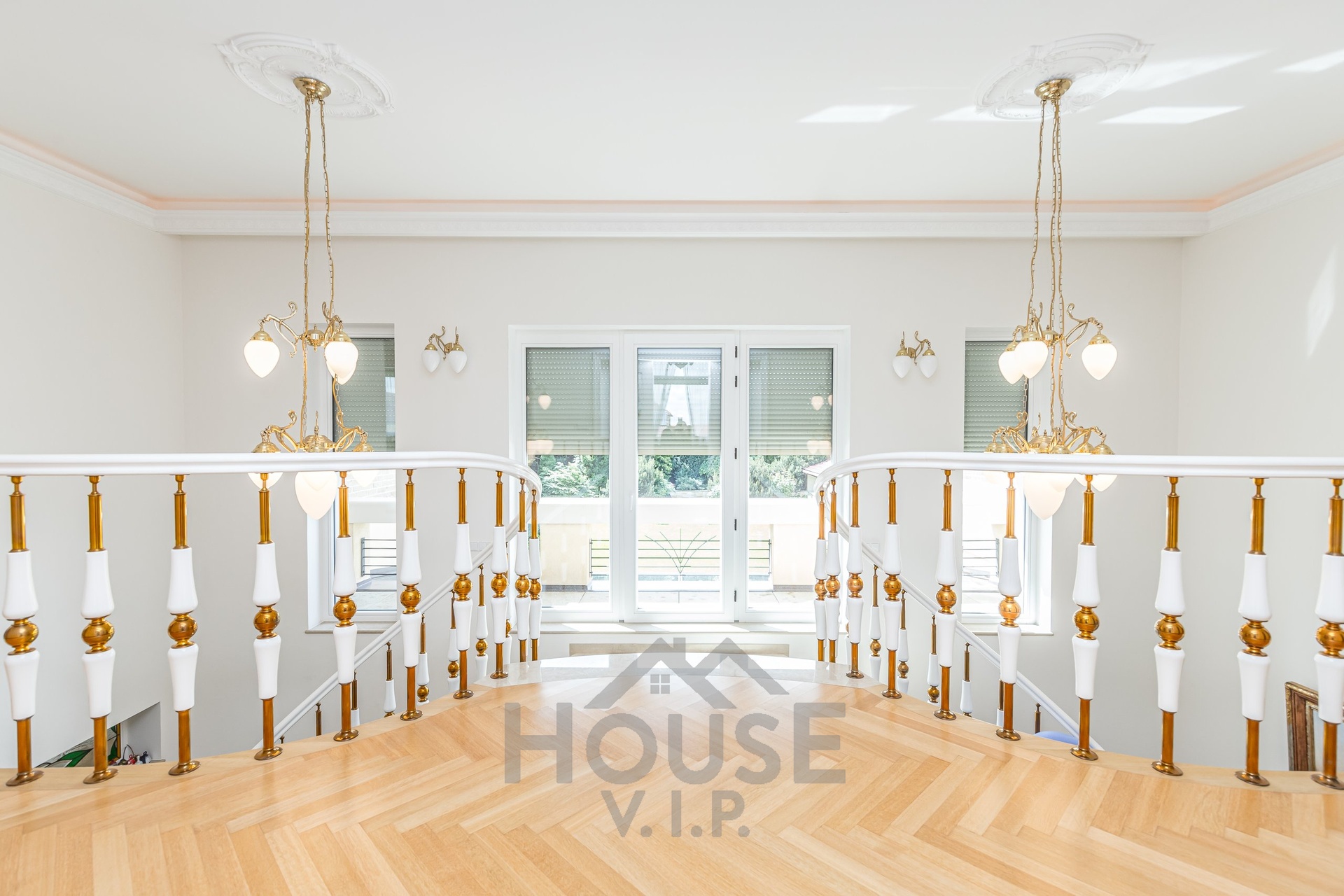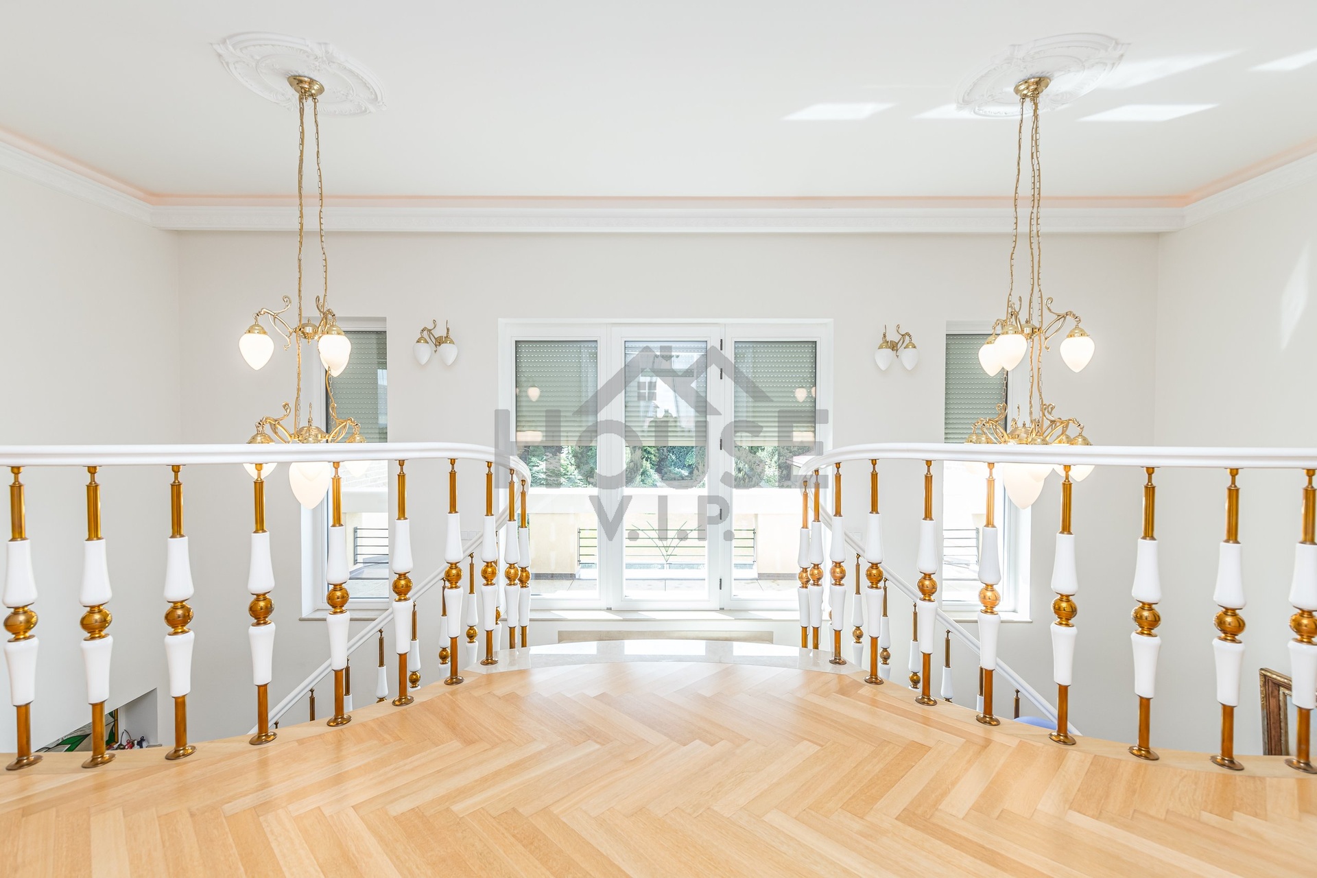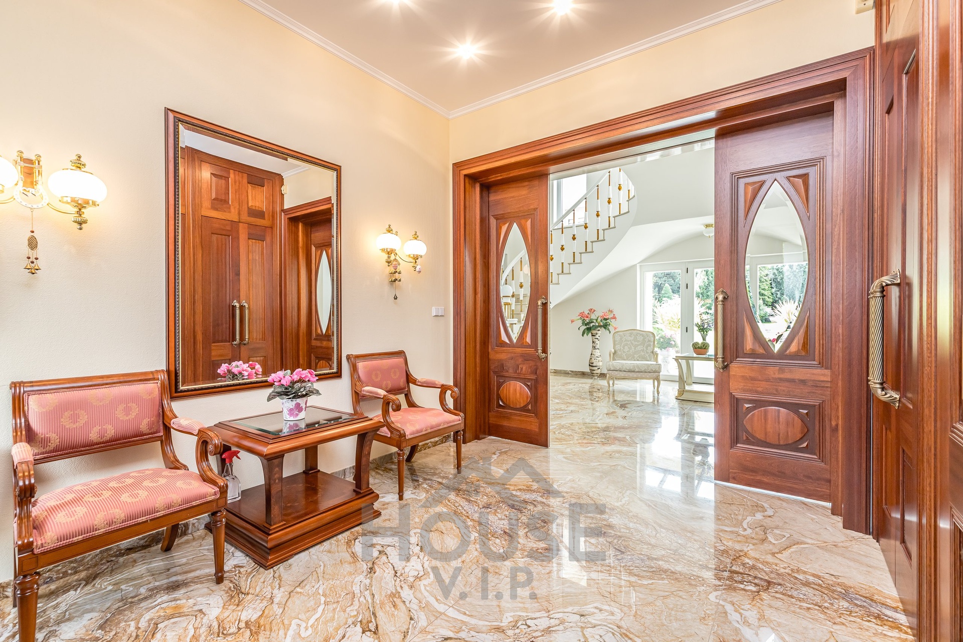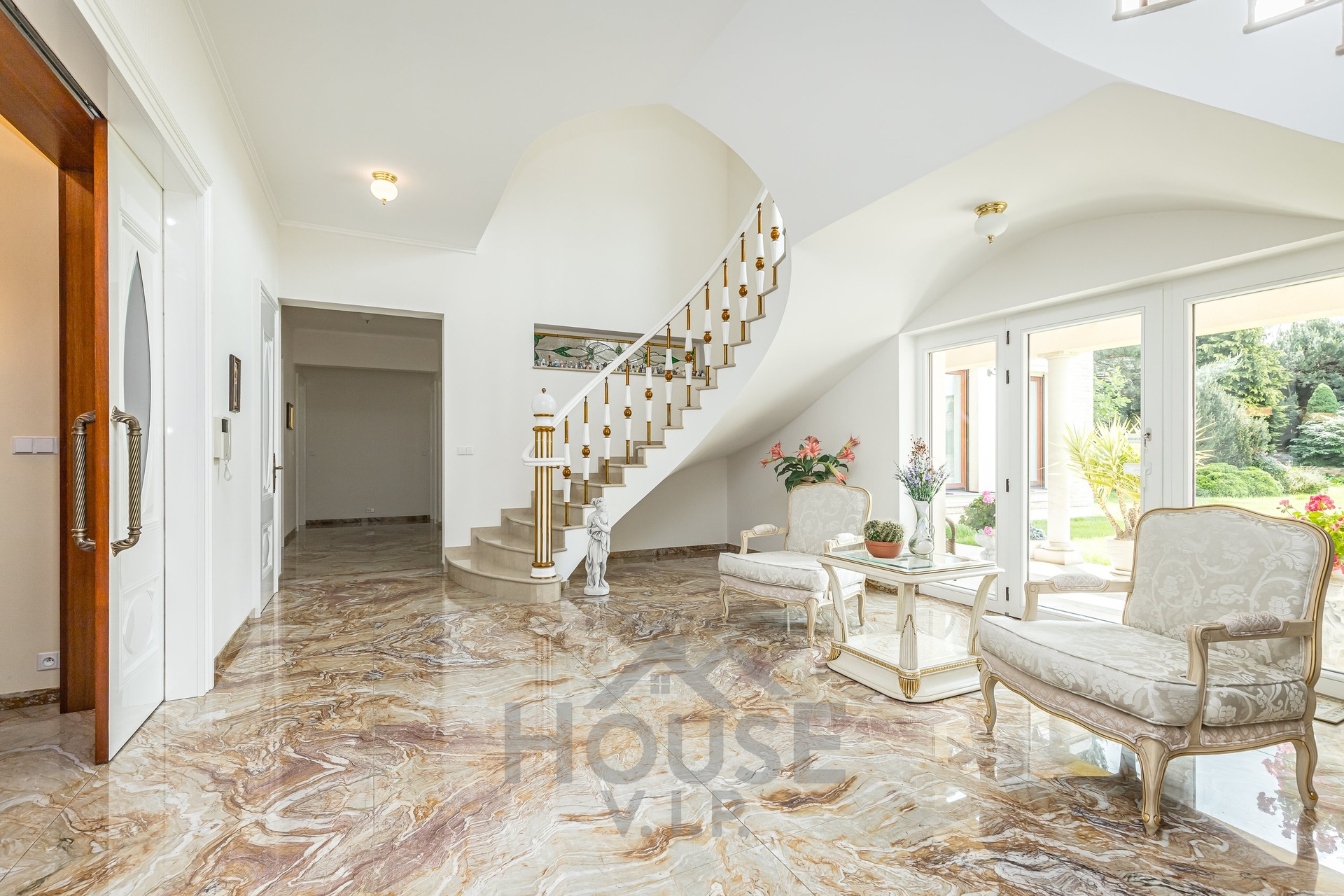 V přízemí domu se nachází velká vstupní hala se vstupem do prostorné šatny. Posuvnými inkrustovanými dveřmi se vchází do velké nádherné haly s mramorovým schodištěm do horního patra a přístupem do krásné zahrady, v obou místnostech jsou úžasné mramorové podlahy.