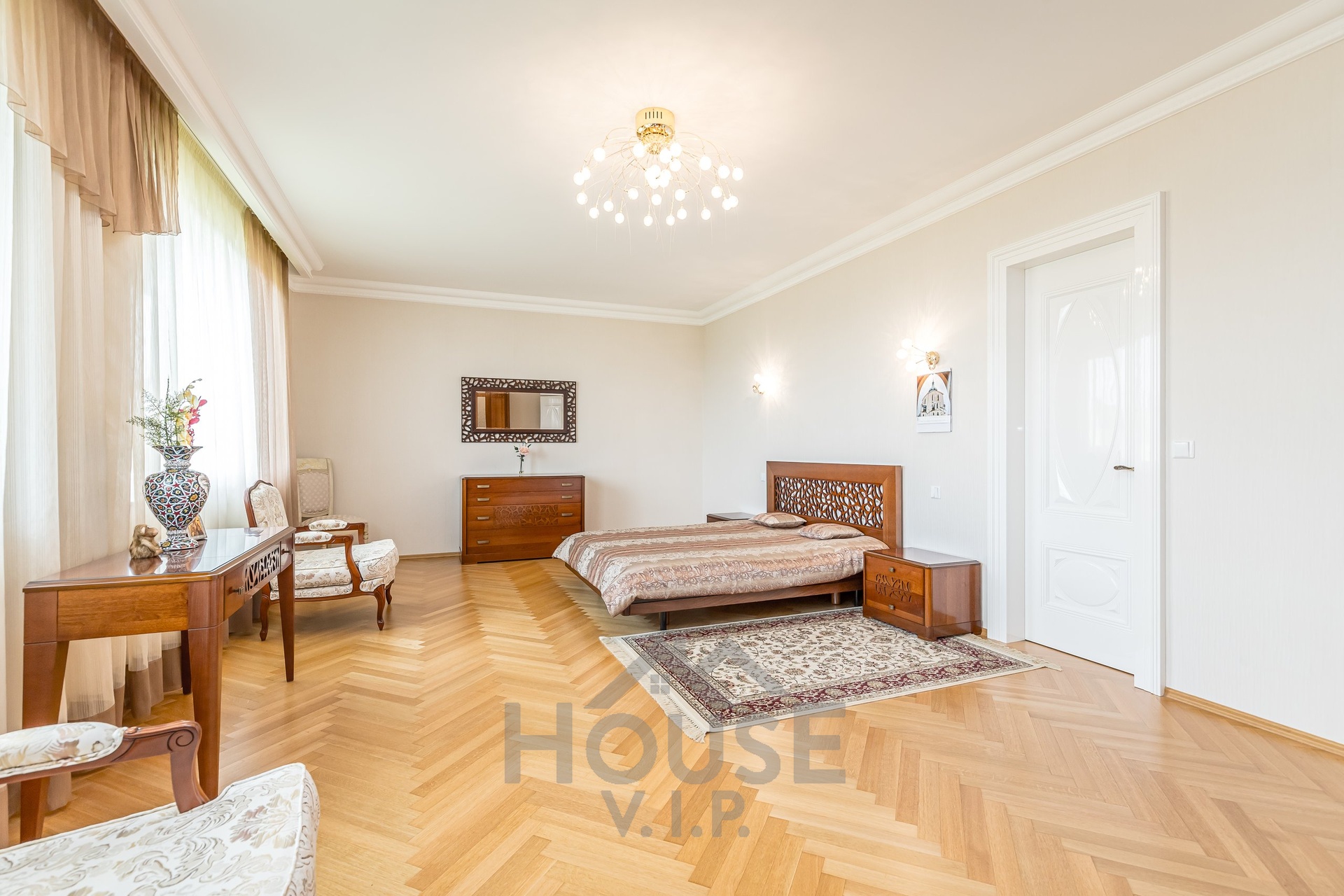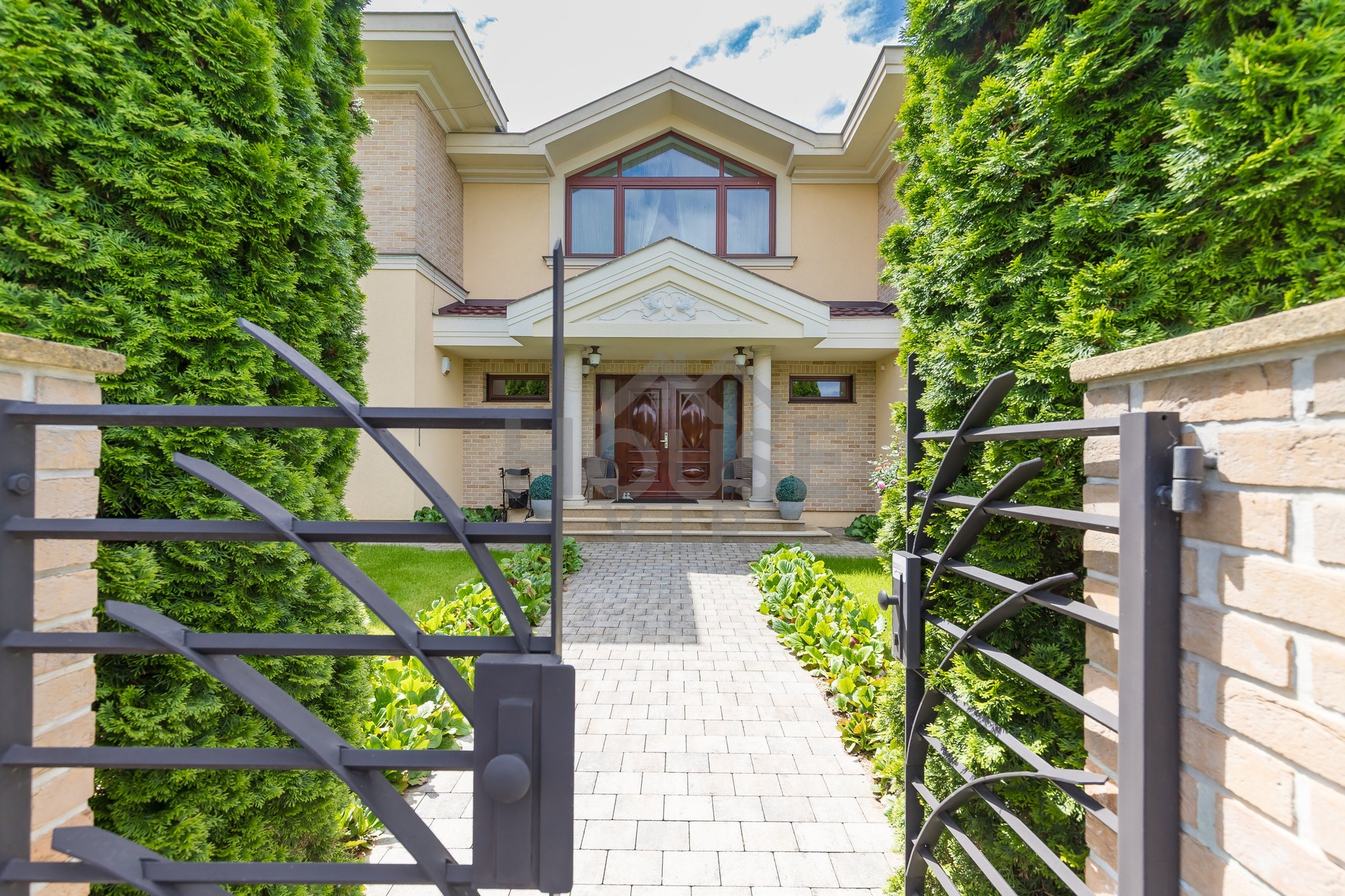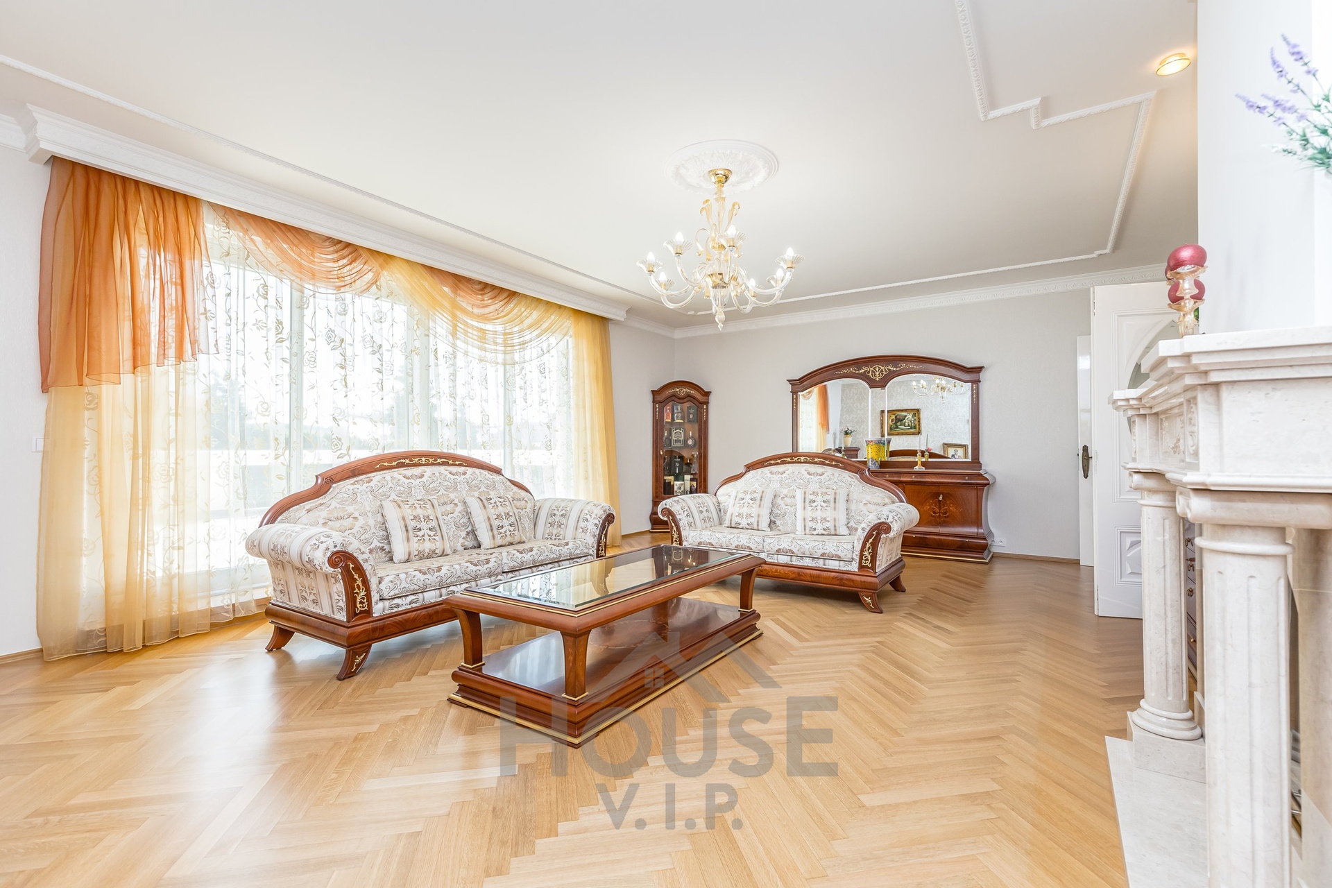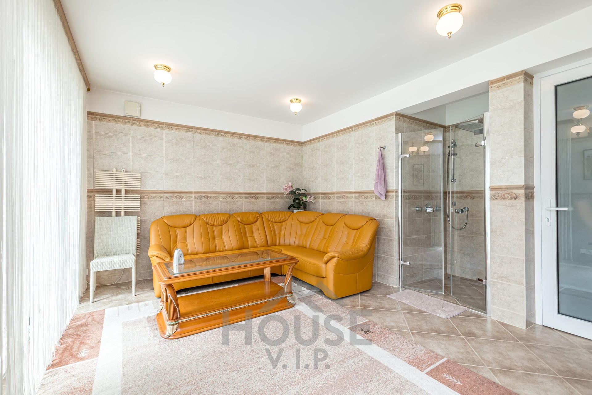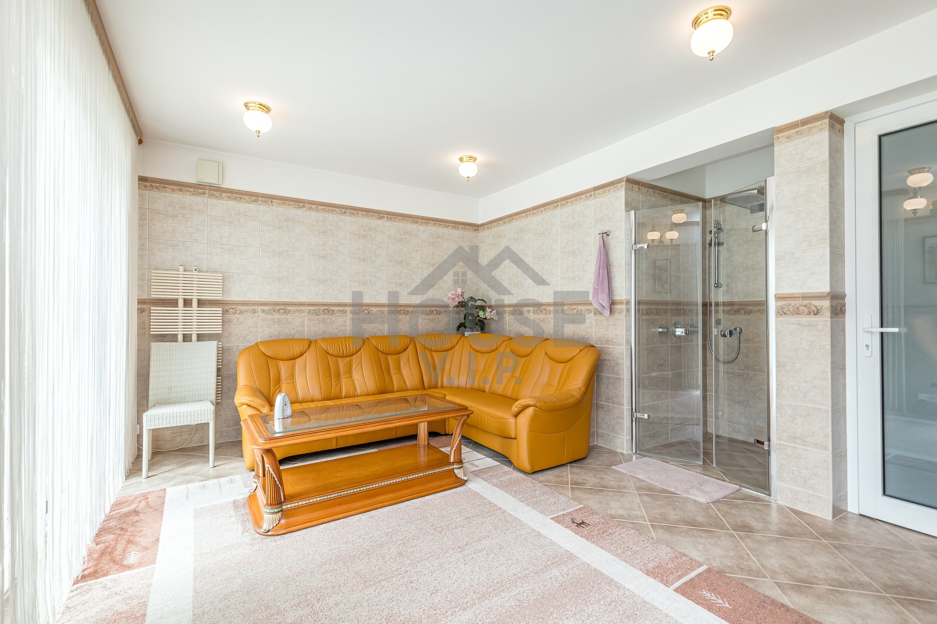 V přízemí domu se nachází velká vstupní hala se vstupem do prostorné šatny. Posuvnými inkrustovanými dveřmi se vchází do velké nádherné haly s mramorovým schodištěm do horního patra a přístupem do krásné zahrady, v obou místnostech jsou úžasné mramorové podlahy.