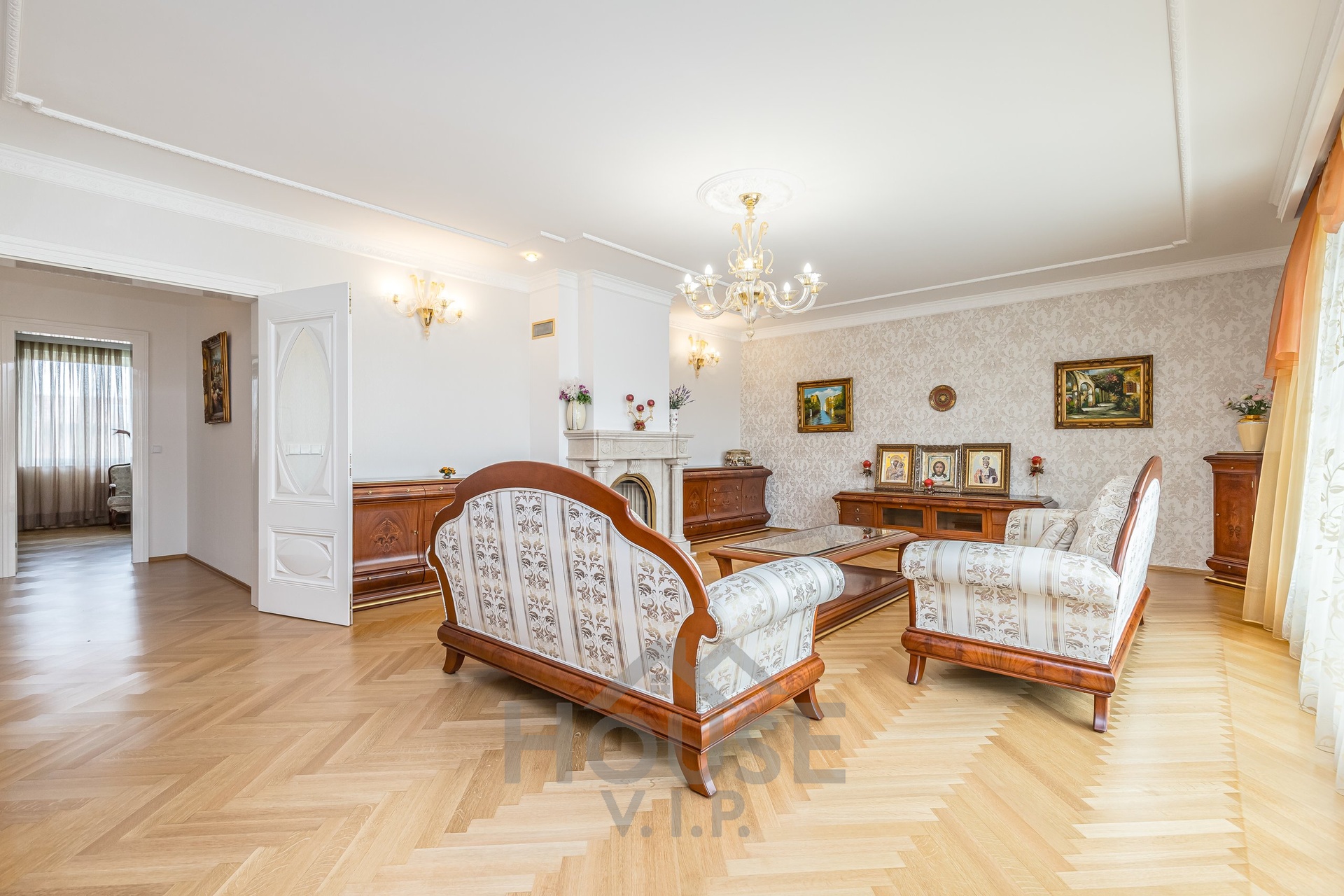 V prvním patře se nachází velký světlý obývací pokoj s architektonickým mramorovým krbem a italským nábytkem. Z obývacího pokoje je přístup na velkou terasu.