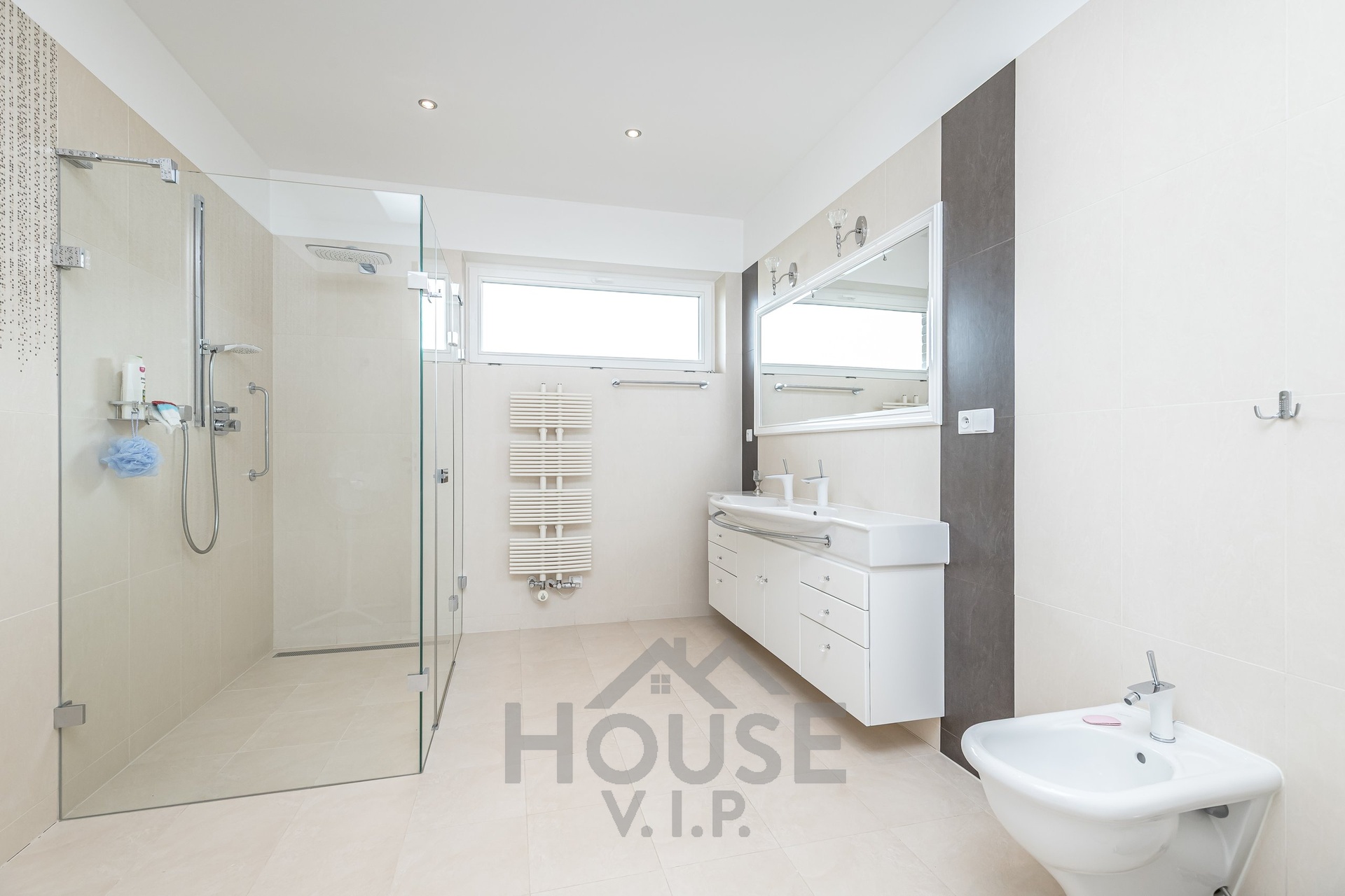 Dále jsou zde 2 ložnice, každá s vlastní toaletní místností, vybavenou sprchou a bidetem, a toaleta pro návštěvy.