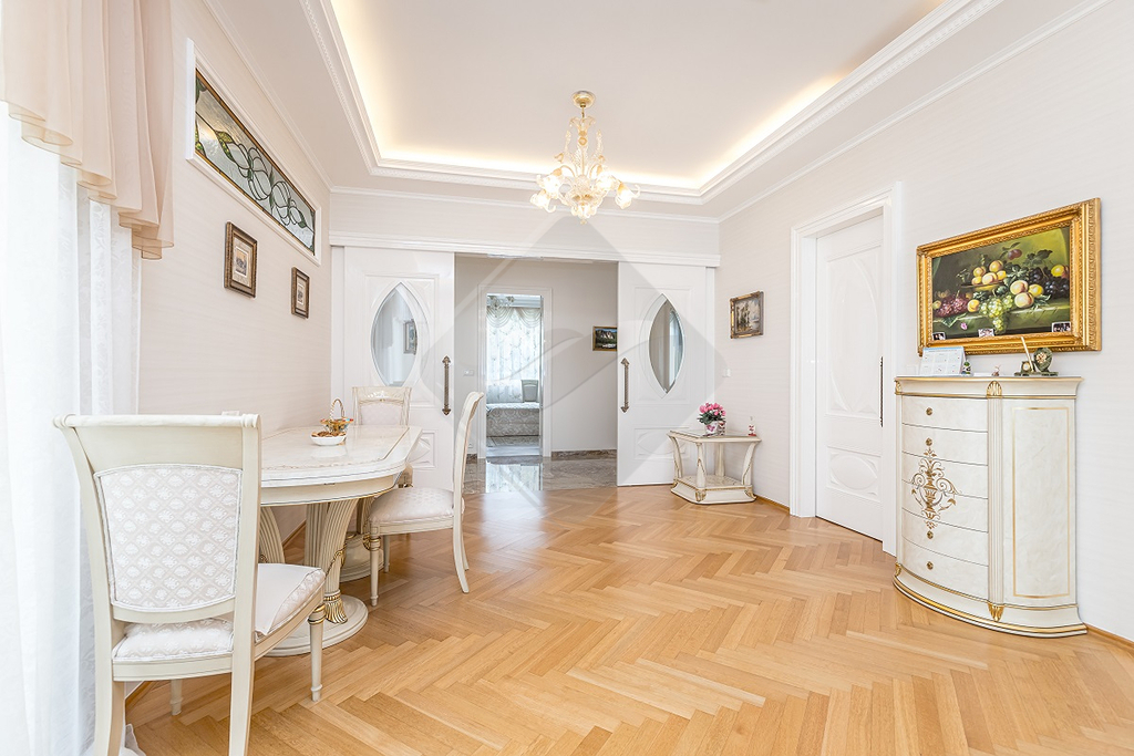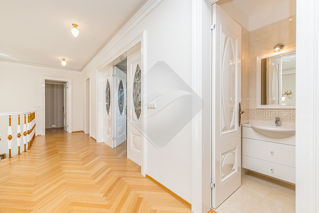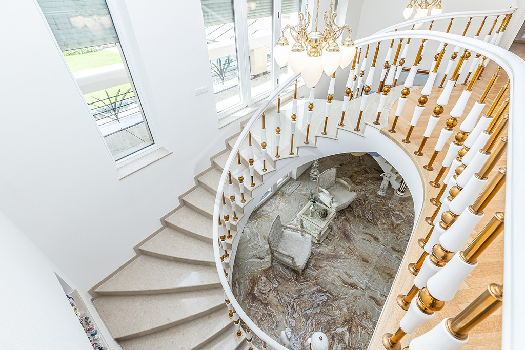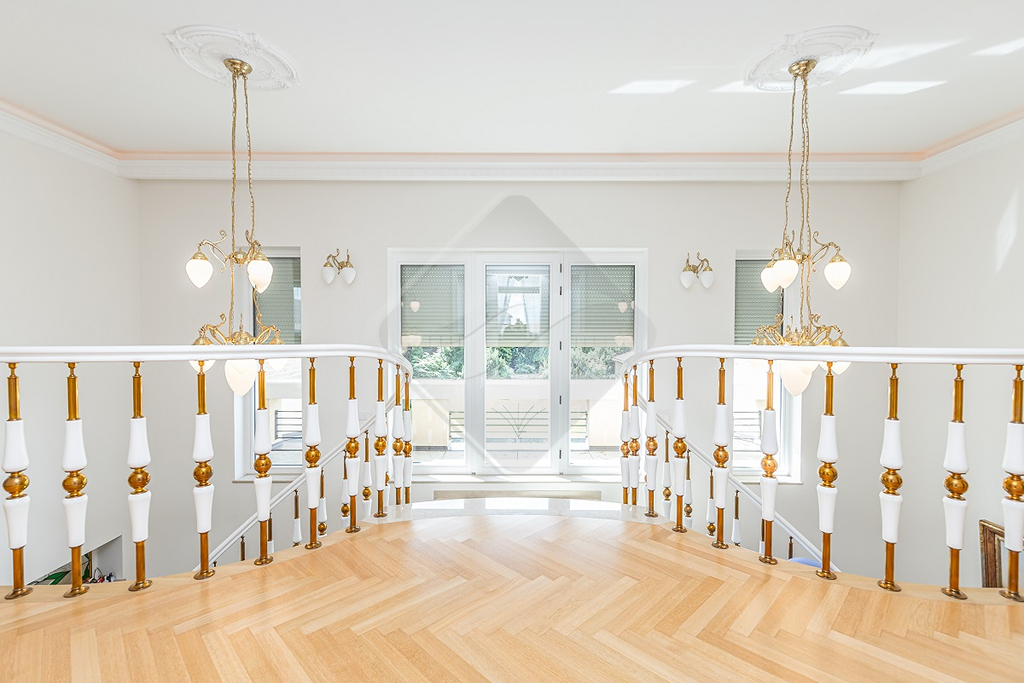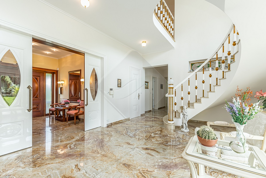 V přízemí domu se nachází velká vstupní hala se vstupem do prostorné šatny. Posuvnými inkrustovanými dveřmi se vchází do velké nádherné haly s mramorovým schodištěm do horního patra a přístupem do krásné zahrady, v obou místnostech jsou úžasné mramorové podlahy.