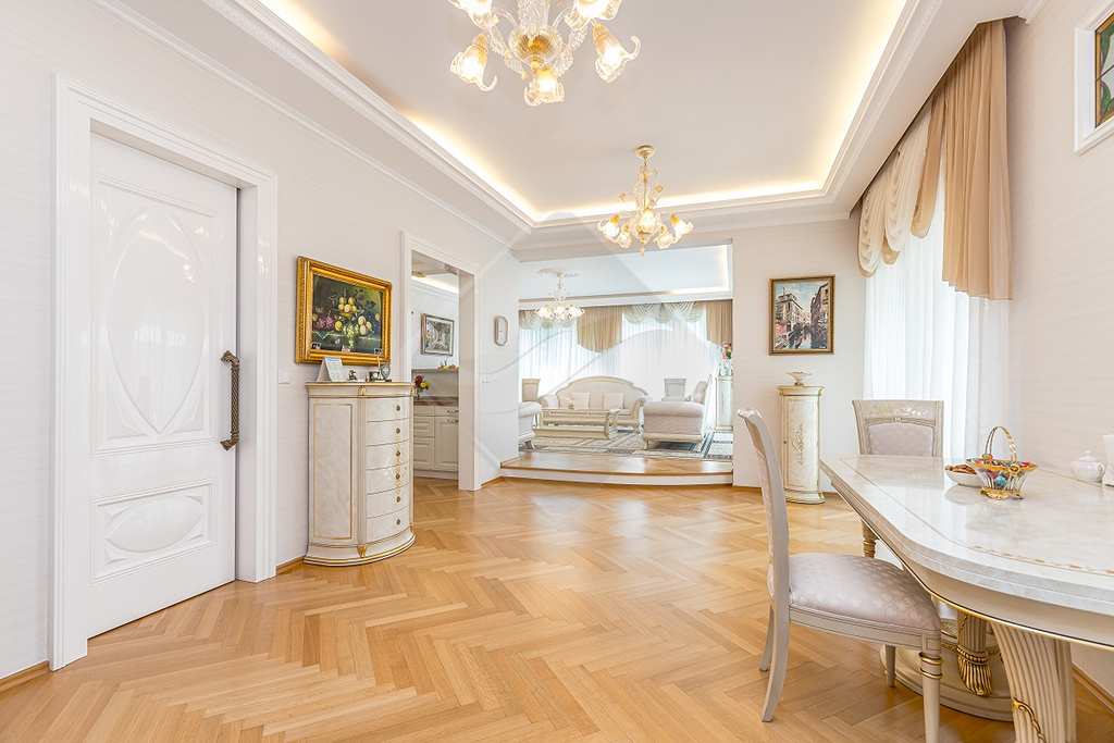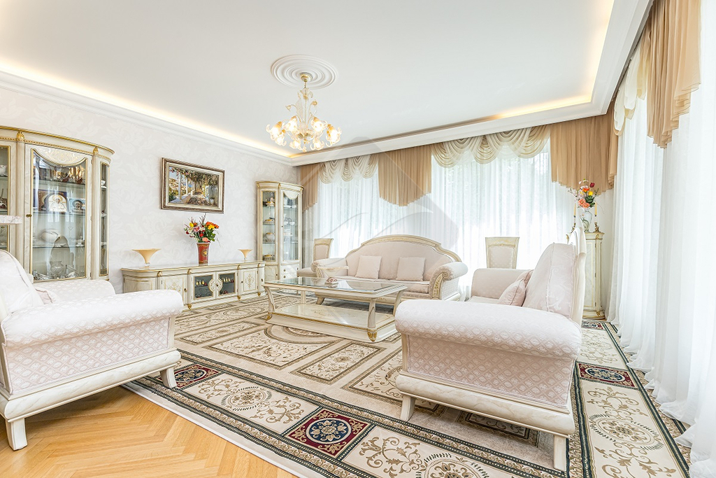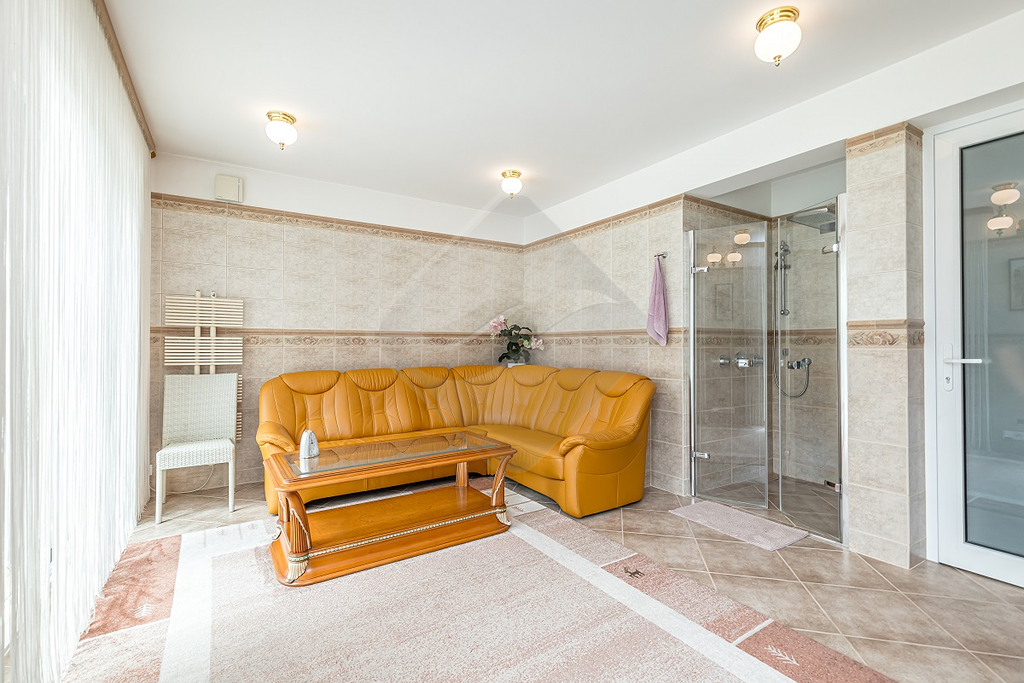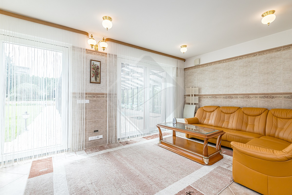 V přízemí se nachází velký krásný obývací pokoj se světlým italským nábytkem, který je propojen s jídelnou a kuchyní jako jeden komplex pro setkání a oslavy. Z jídelny je přístup na velkou krytou terasu a do zahrady.