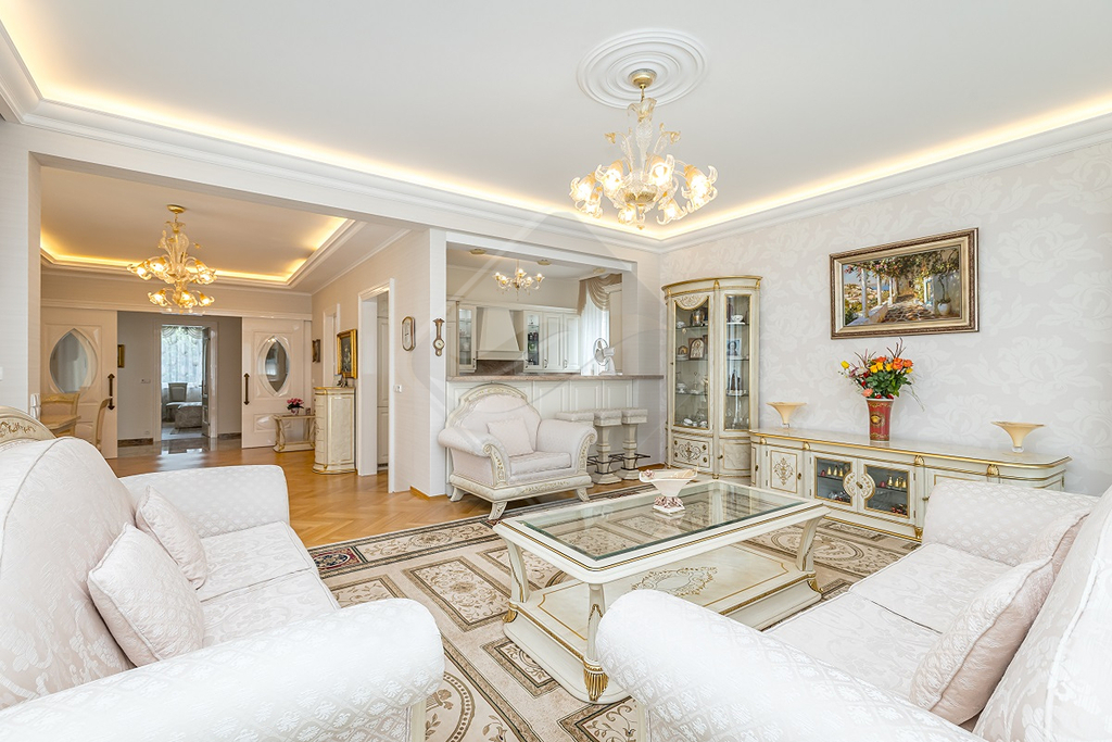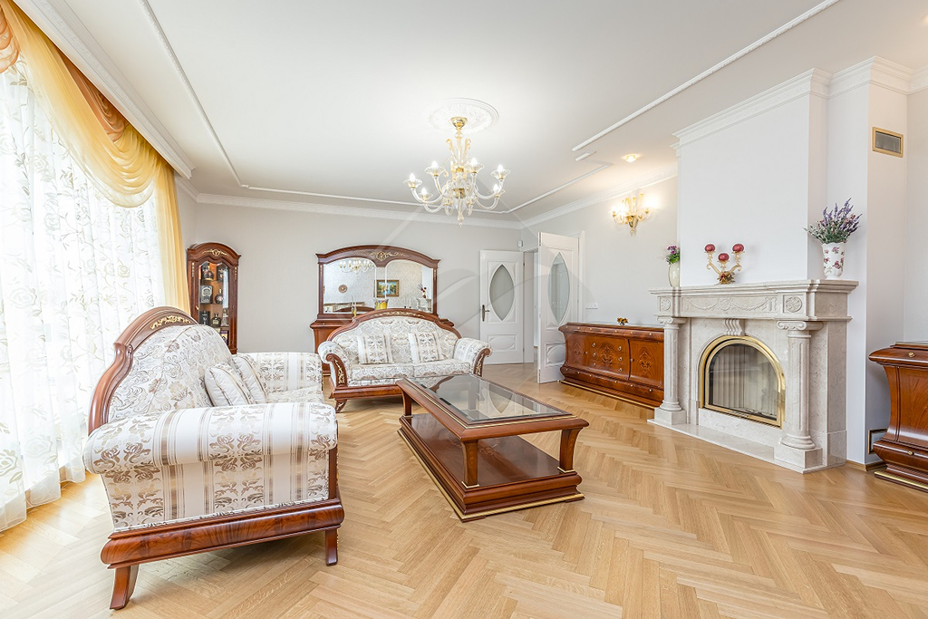V prvním patře se nachází velký světlý obývací pokoj s architektonickým mramorovým krbem a italským nábytkem. Z obývacího pokoje je přístup na velkou terasu.
