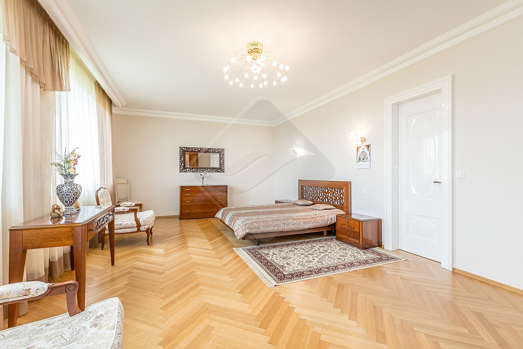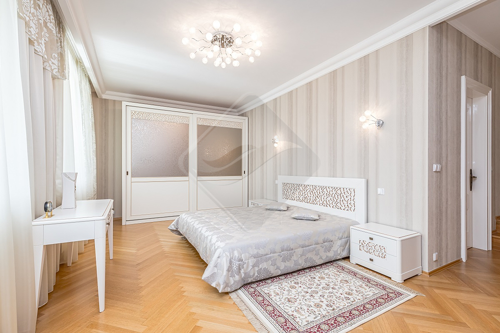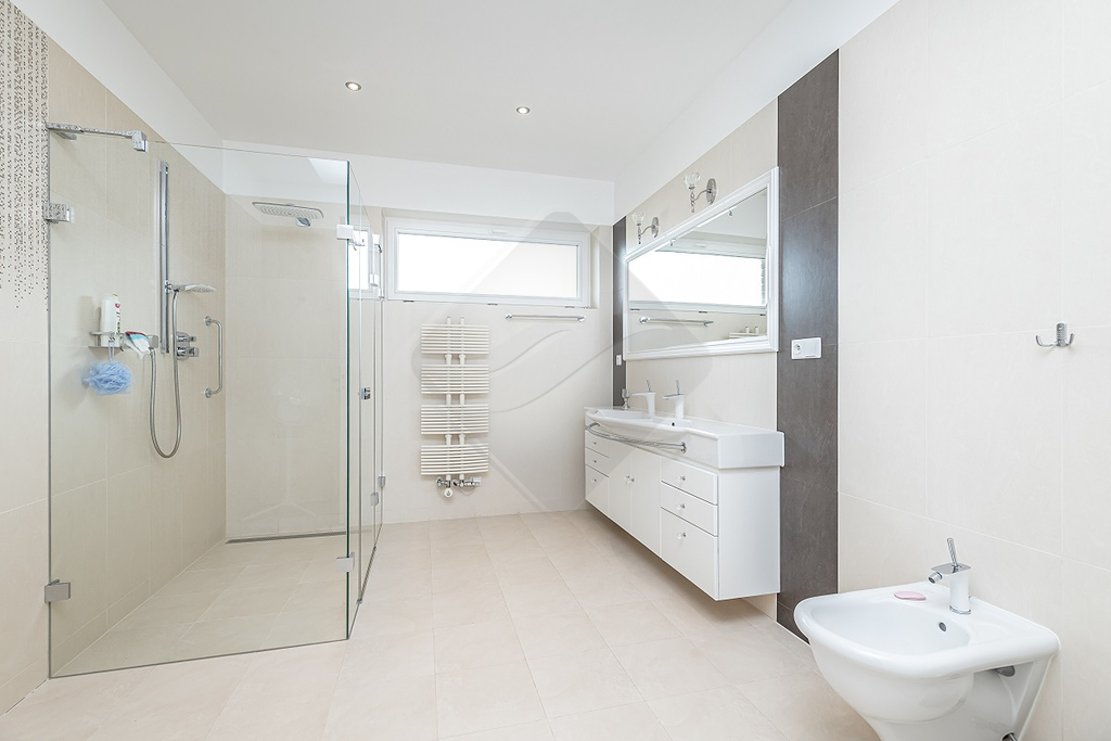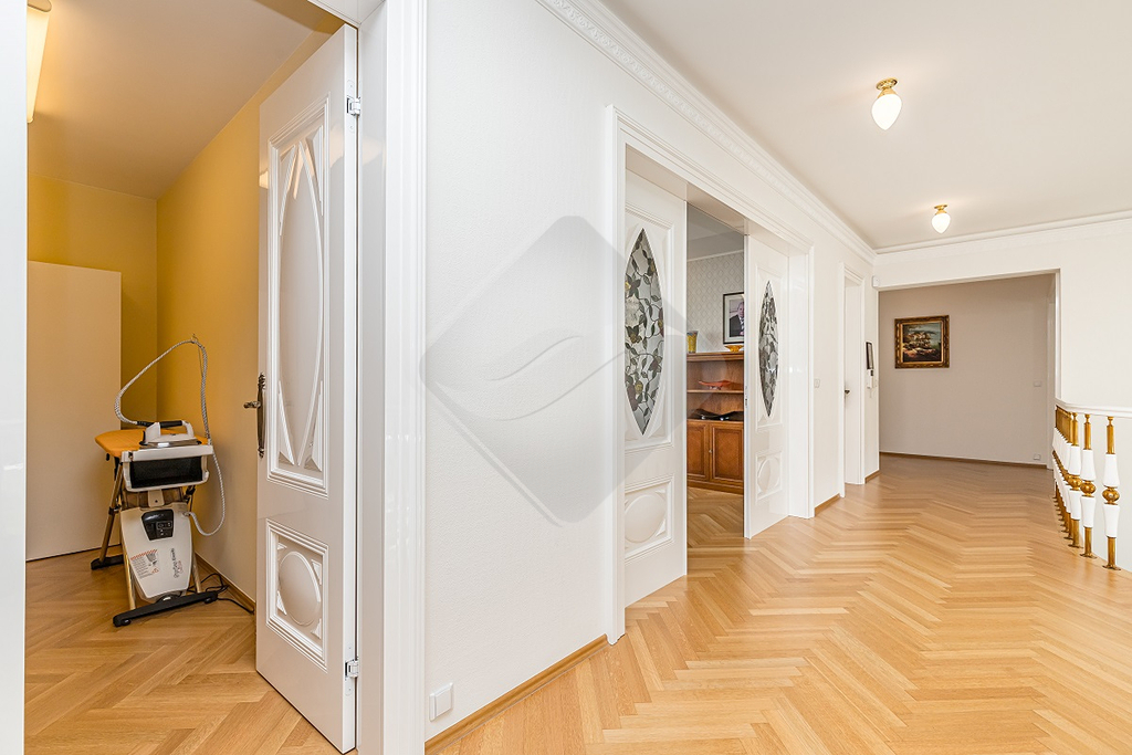 Dále se v patře nacházejí 2 velké zařízené ložnice, každá s vlastní koupelnou, a dobře vybavená pracovna s archivem, technické místnosti - žehlírna s úložnou skříní.