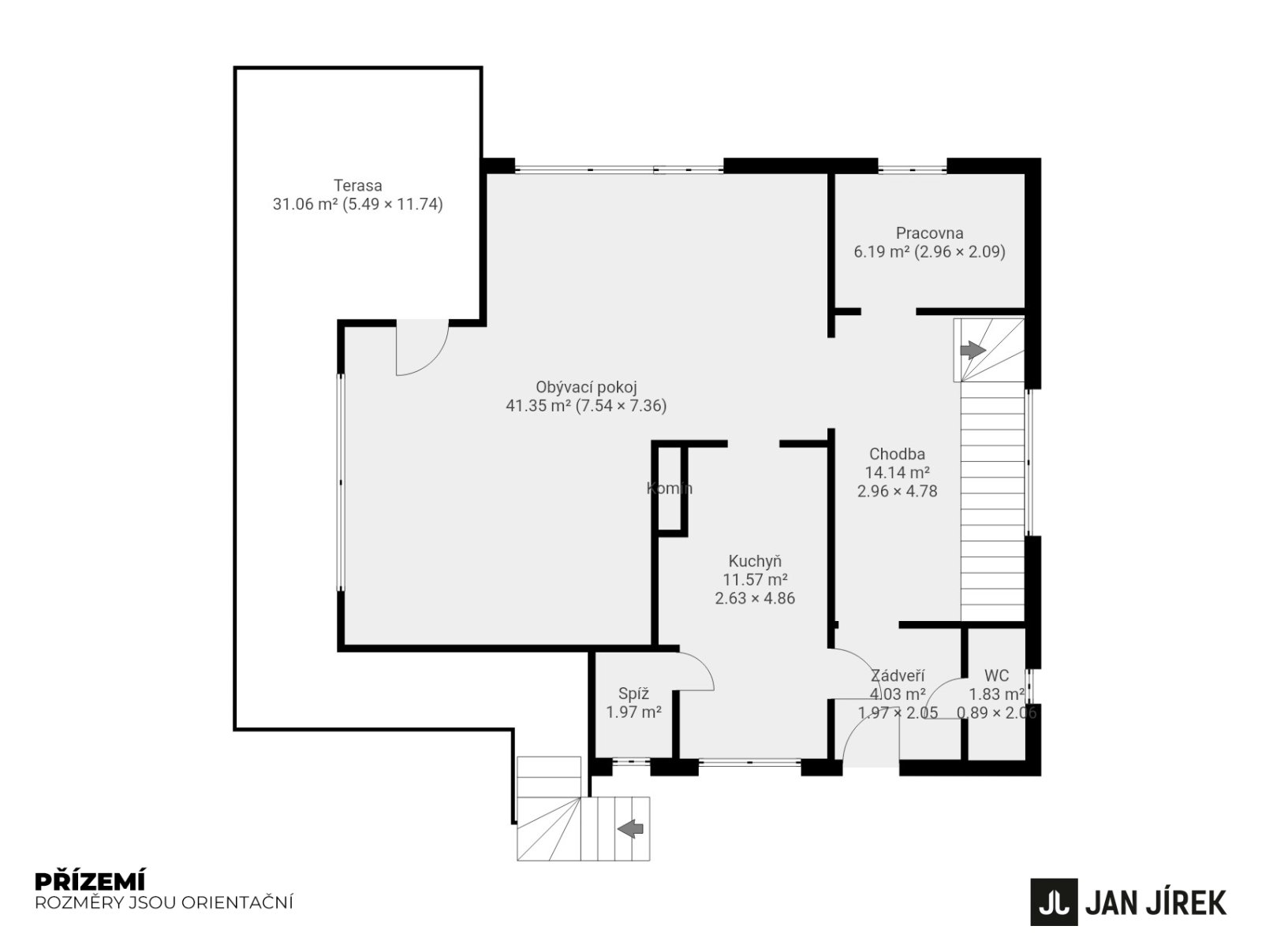 V přízemí se nachází prostorný obývací pokoj s jídelnou, kuchyň, spíž, samostatná toaleta a pracovna. Světlá výška místností je 2,55 m.