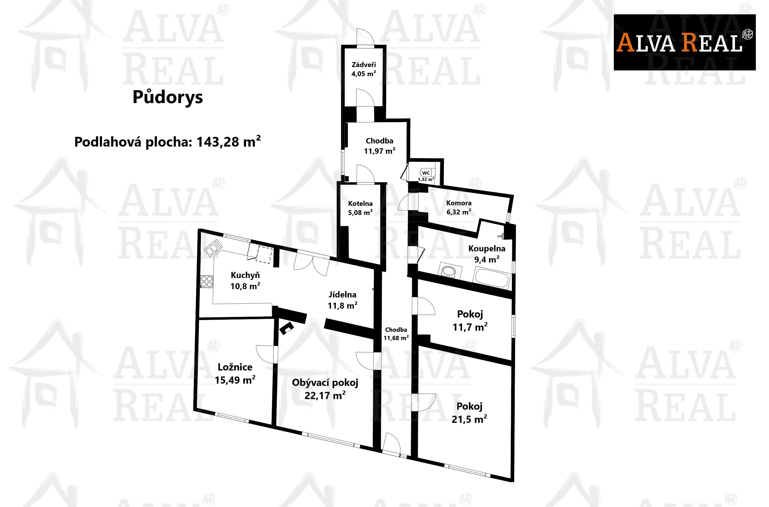 Dispozice: Obývací pokoj 22,17 m²; kuchyň 10,8 m²; jídelna 11,8 m²; ložnice 15,49 m²; pokoj 21,5 m²; pokoj 11,7 m²; koupelna 9,4 m²; komora 6,32 m²; WC 1,32 m²; kotelna 5,08 m²; chodba 11,68 m²; chodba 11,97 m²; zádveří 4,05 m².