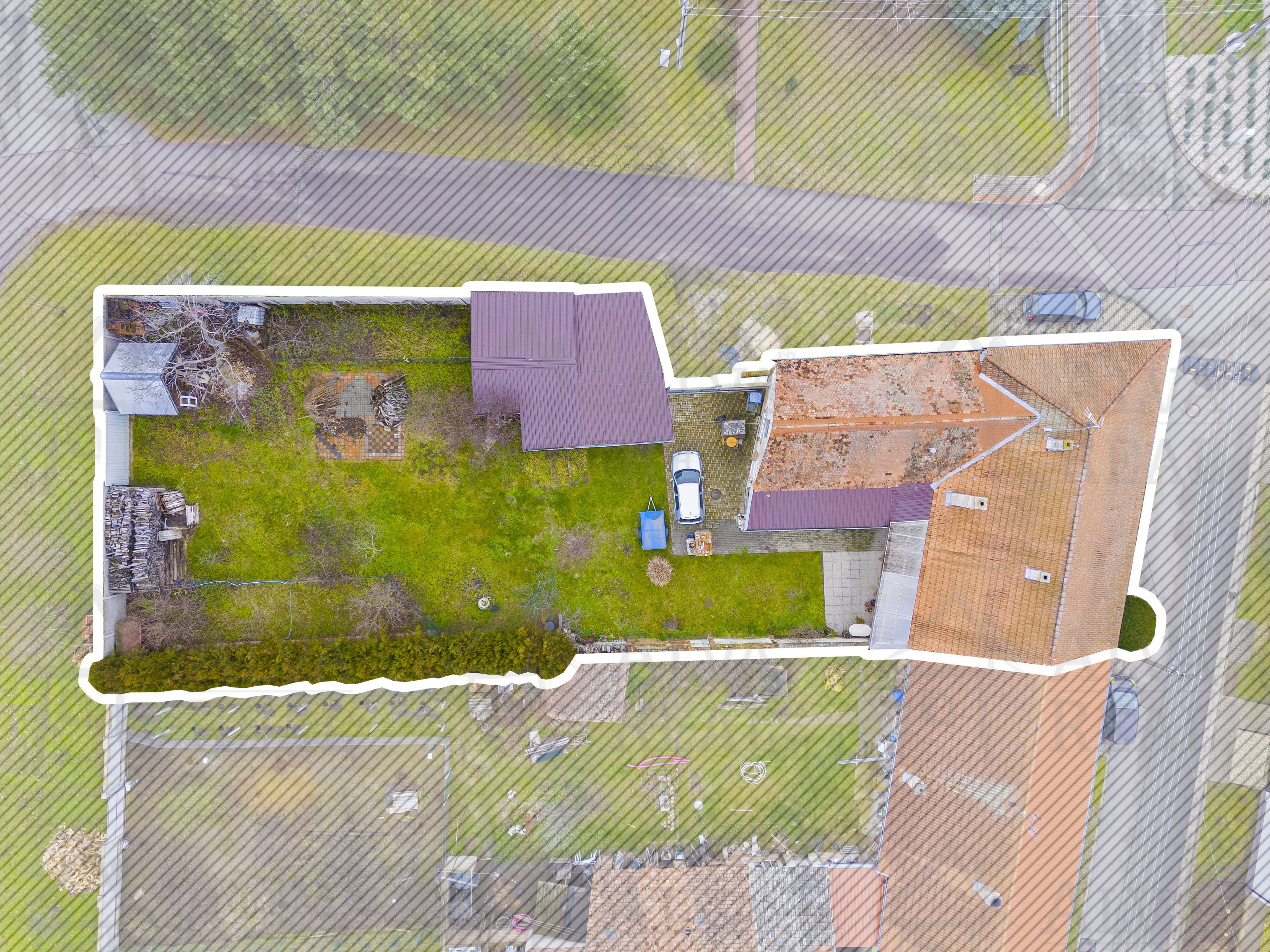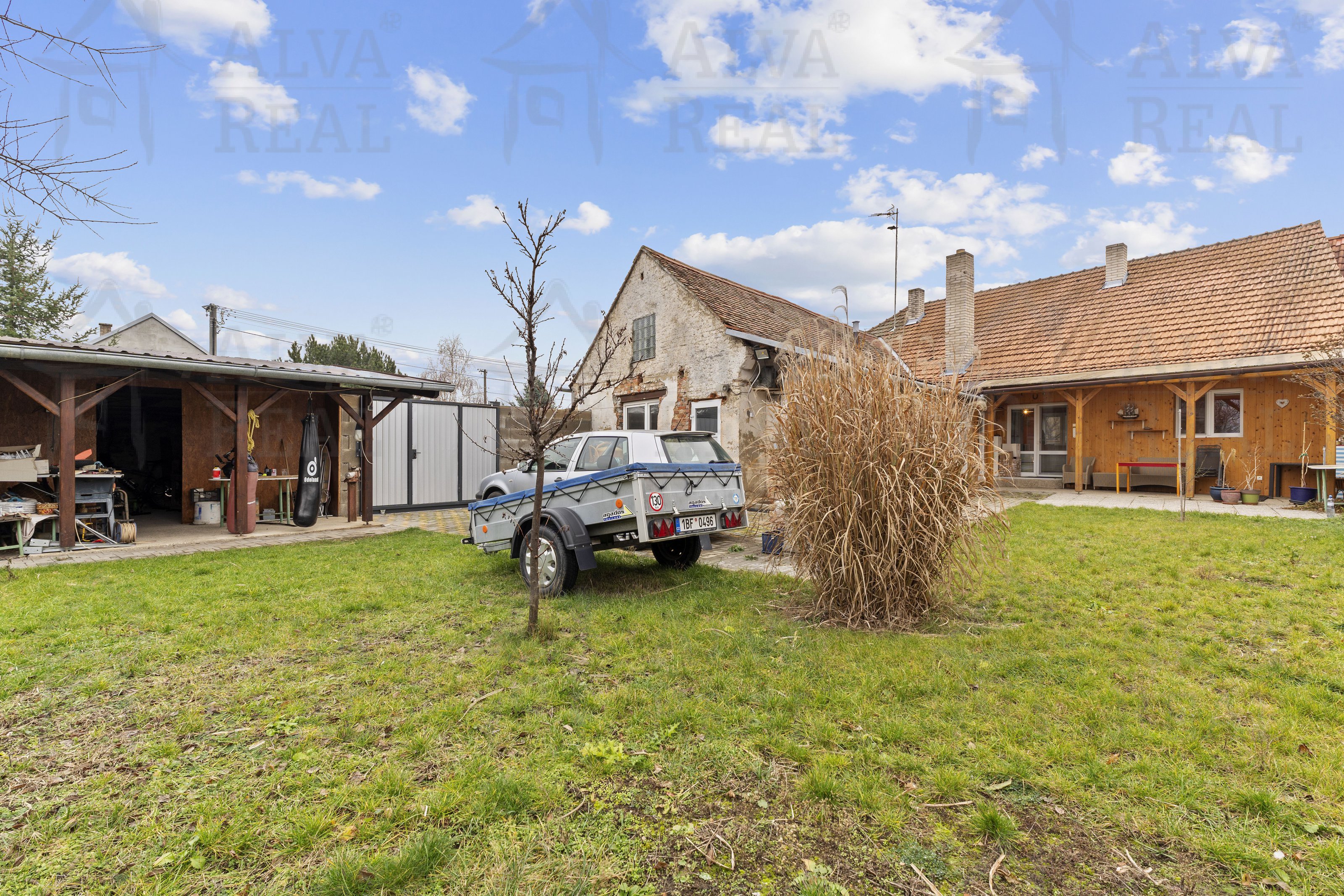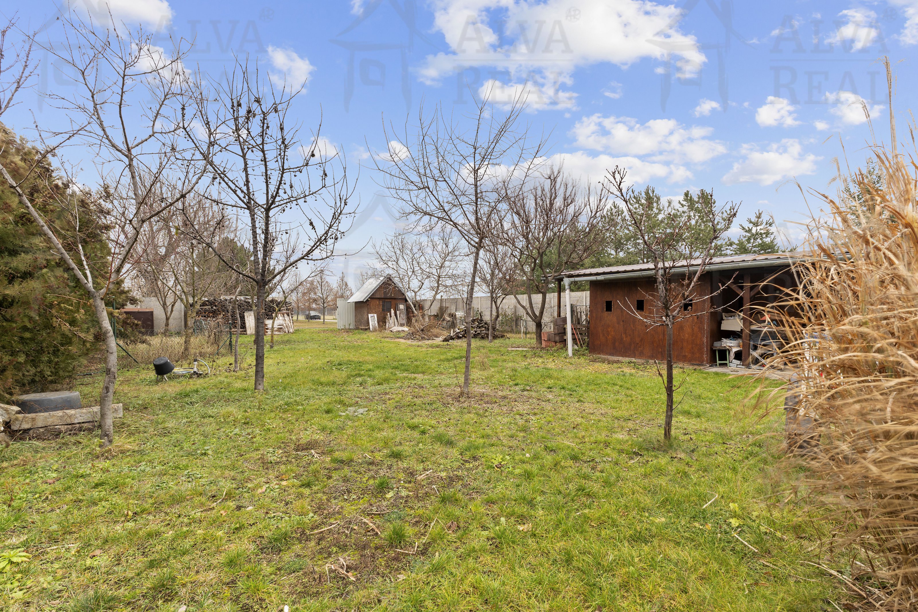 Zahrada je oplocená, součástí jsou dva vjezdy na pozemek, část zahrady vydlážděna zámkovou dlažbou pro pohodlné zaparkování a část oplocení lemují vzrostlé dřeviny, které zahradě dodávají přirozený vzhled. V pravé části pozemku za domem se nachází dřevěný přístřešek, který tvoří tři části (dílna, kotec a voliéra), v zadní části volně stojící bouda.