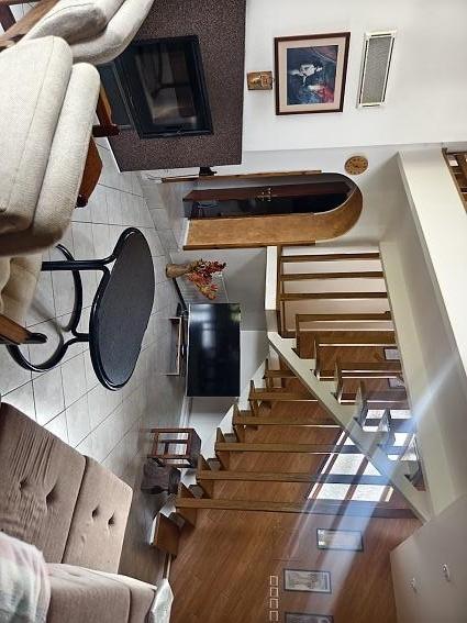 V pokojích tvoří podlahy vinyl, schody k nim z masivního dřeva, což platí i pro zábradlí.