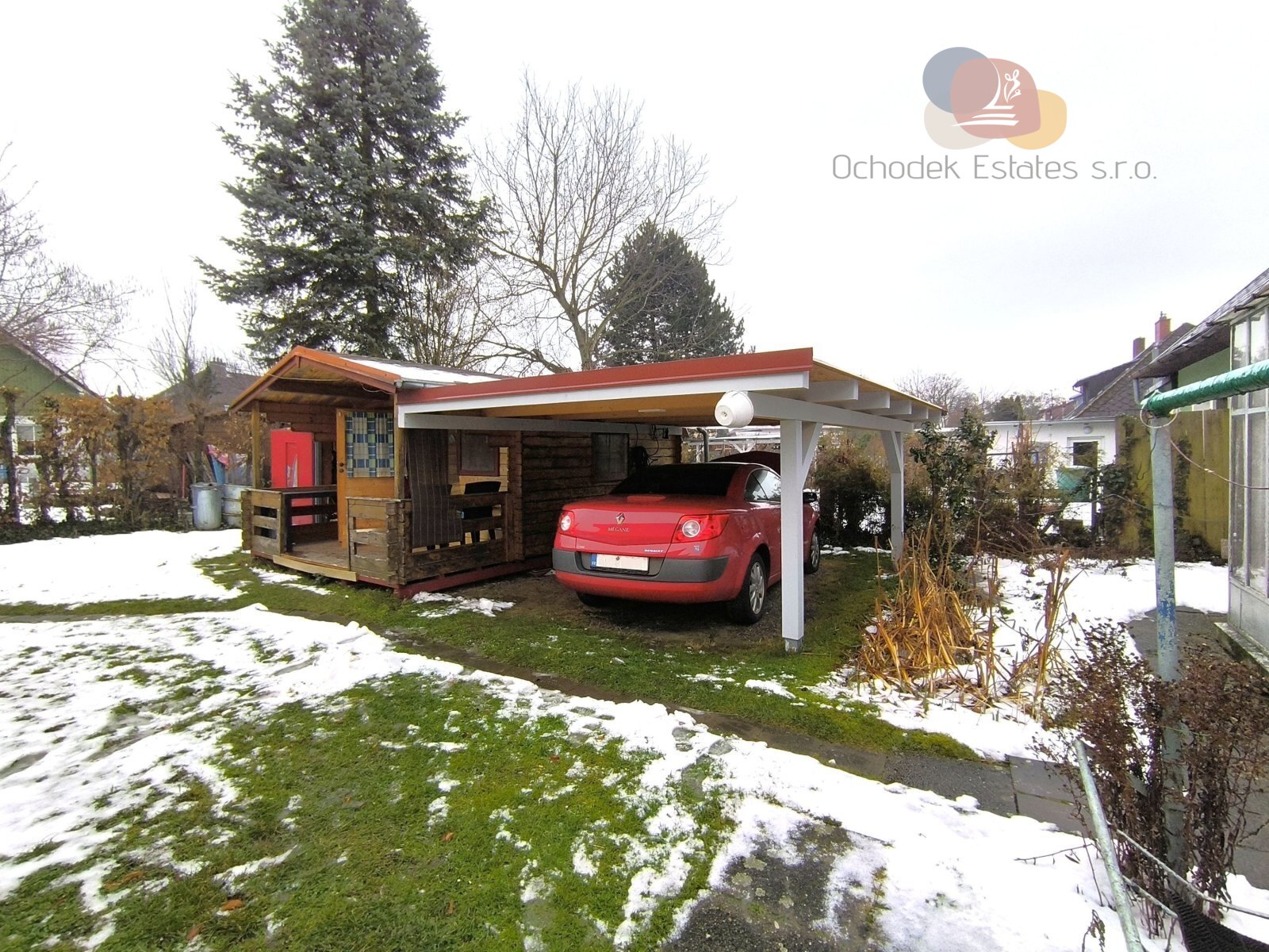 - zahrada s novým přístřeškem na auto, zahradní chata na nářadí, 3 dlážděná parkovací stání