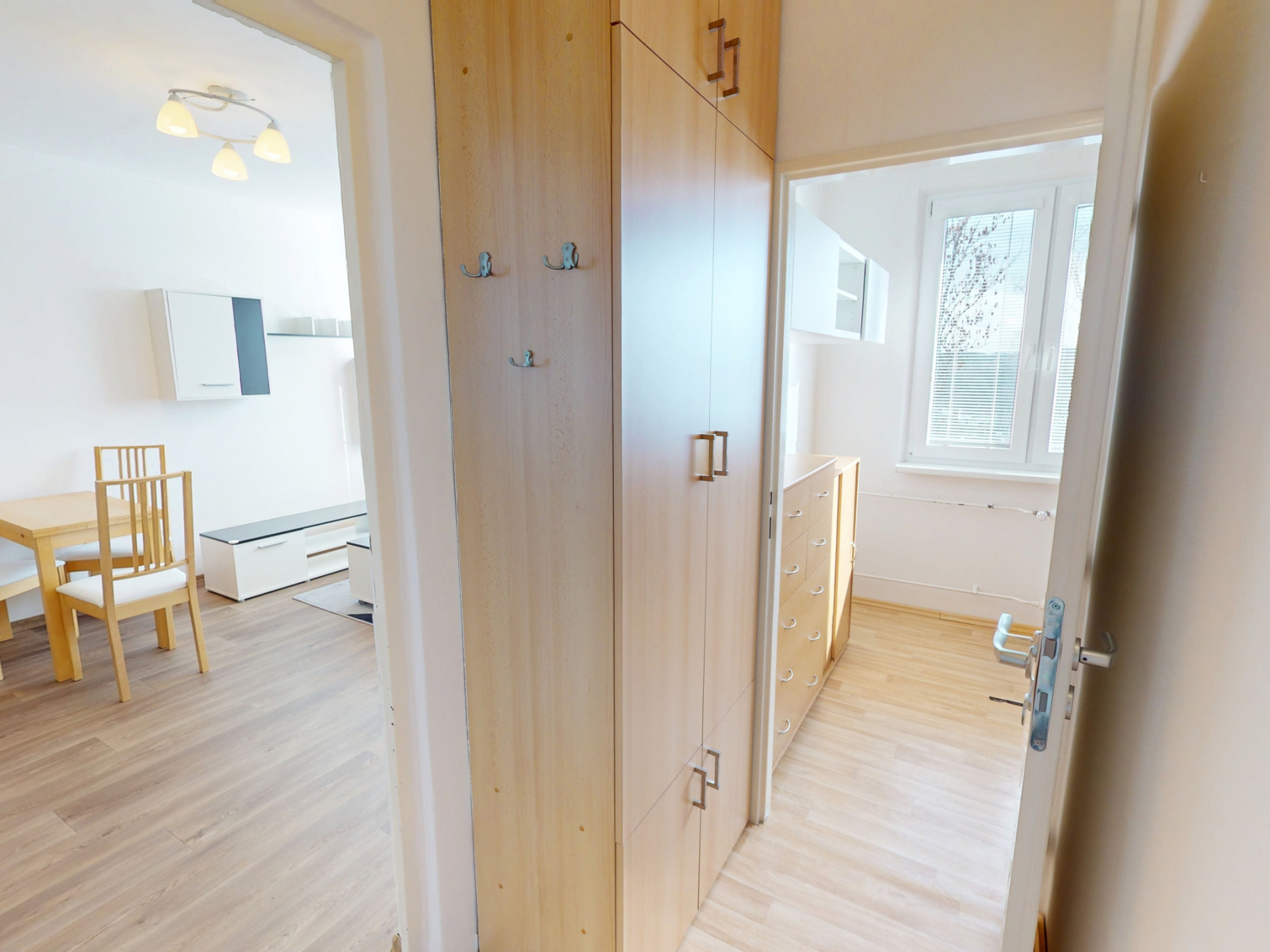 Koupelna je se sprchovým koutem, umyvadlovou skříňkou a toaletou (společně). Byt je částečně vybaven.