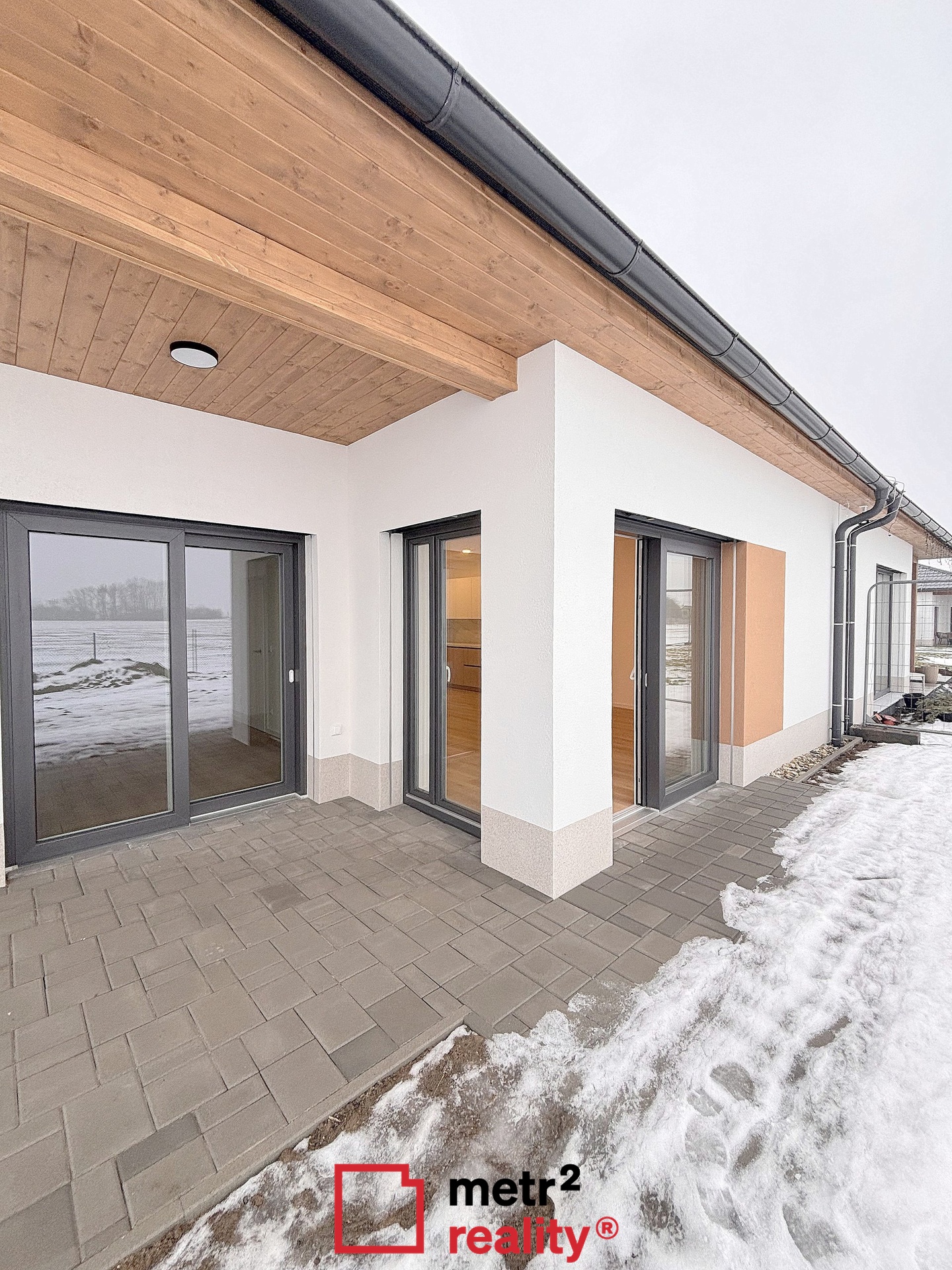 Nabízíme Vám k pronájmu moderní novostavbu zděného přízemního pasivního rodinného domu v obci Hnojice. Dispozice domu je 4+kk s celkovou užitnou plochou 97 m2 a pozemkem o celkové výměře 633 m2. Dům v řadové zástavbě s terasou 25 m2 je nepodsklepený, ze které je krásný výhled na Jeseníky. Vytápění domu je řešeno pomocí teplovodního systému, který obsahuje tepelné čerpadlo typu vzduch-voda, které zajišťuje pokrytí tepelných ztrát objektu. Součástí tepelného čerpadla je i zásobník na TUV. Ve všech místnostech RD je podlahové vytápění, které je v koupelně doplněno o topný žebřík. Součástí systému je také centrální rekuperační jednotka, jež zajišťuje přívod čerstvého vzduchu do obytných místností a odvod znehodnoceného (odpadního) vzduchu z koupelny, WC a kuchyně. FVE elektrárna, 3 panely na střeše, jednofázový střídač. Na zahradě je umístěna retenční podzemní nádrž pro sběr a následné využití dešťové vody s kapacitou 8 m3. Dešťová voda je využita na splachování WC a zálivku zahrady. Dům je napojen na vodu z lokálního zdroje, kanalizace obecní. Komfortní parkování pro dvě vozidla před domem s nabíjecím systémem pro elektro vozy. Cena nájemného činí 30.000 Kč měsíčně +3.500 inkaso. Dům je volný od 1.2.2026. PENB skupiny A.