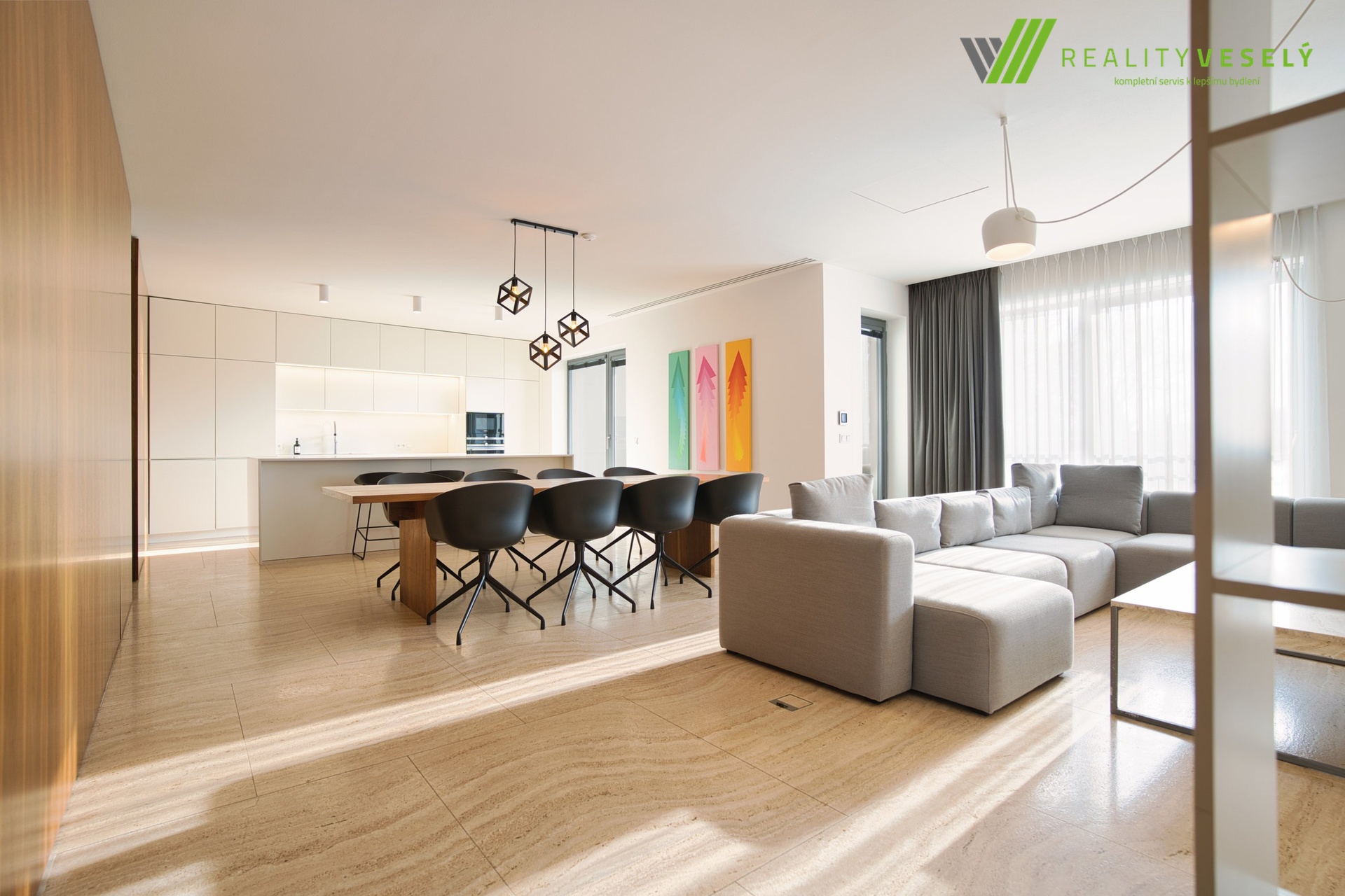 Interiér je navržen s důrazem na praktičnost i estetiku – velkoformátové italské dlažby, kvalitní materiály a promyšlené dispoziční řešení.