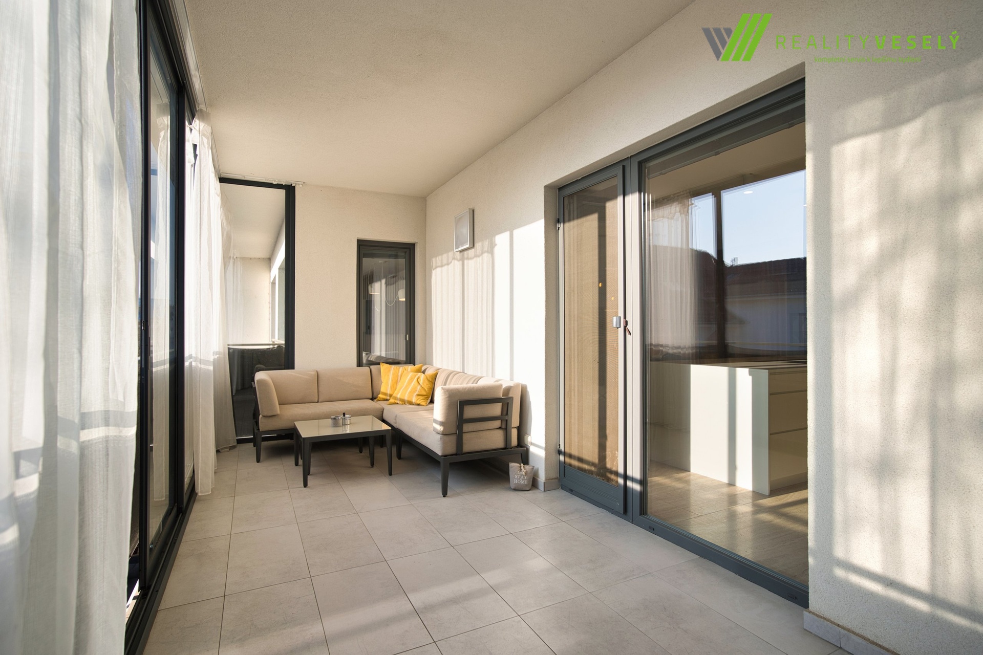 Dominantou bytu je prostorný obývací pokoj s kuchyňským koutem, orientovaný na jih, s přímým vstupem na velkou, zasklenou terasu, která je vybavena klimatizační jednotkou a umožňuje komfortní využití po celý rok. Další obytné pokoje jsou orientovány na sever, což přispívá k příjemnému vnitřnímu klimatu.