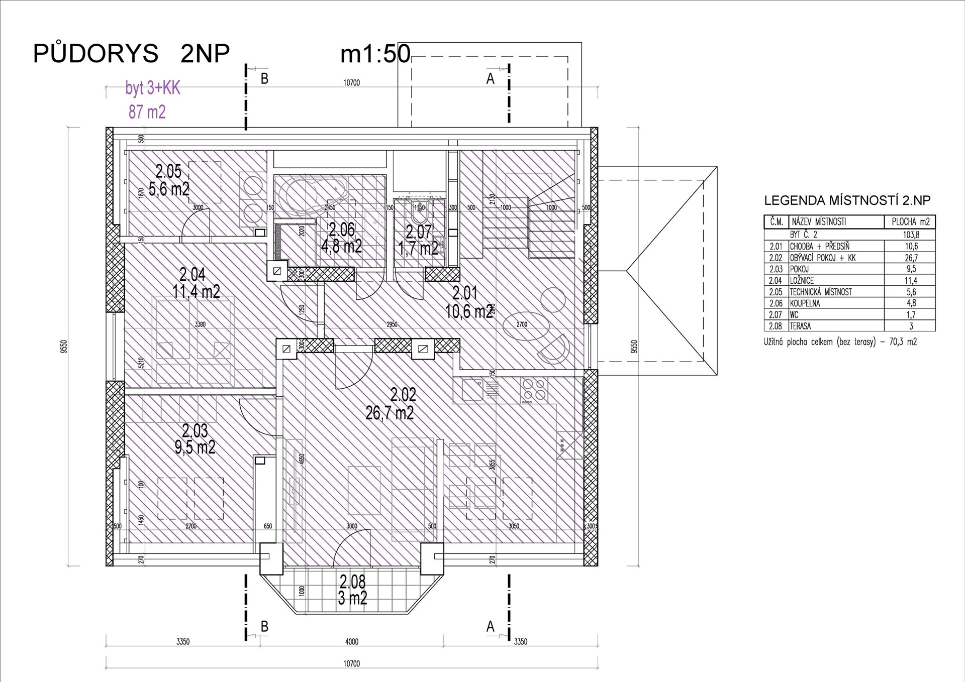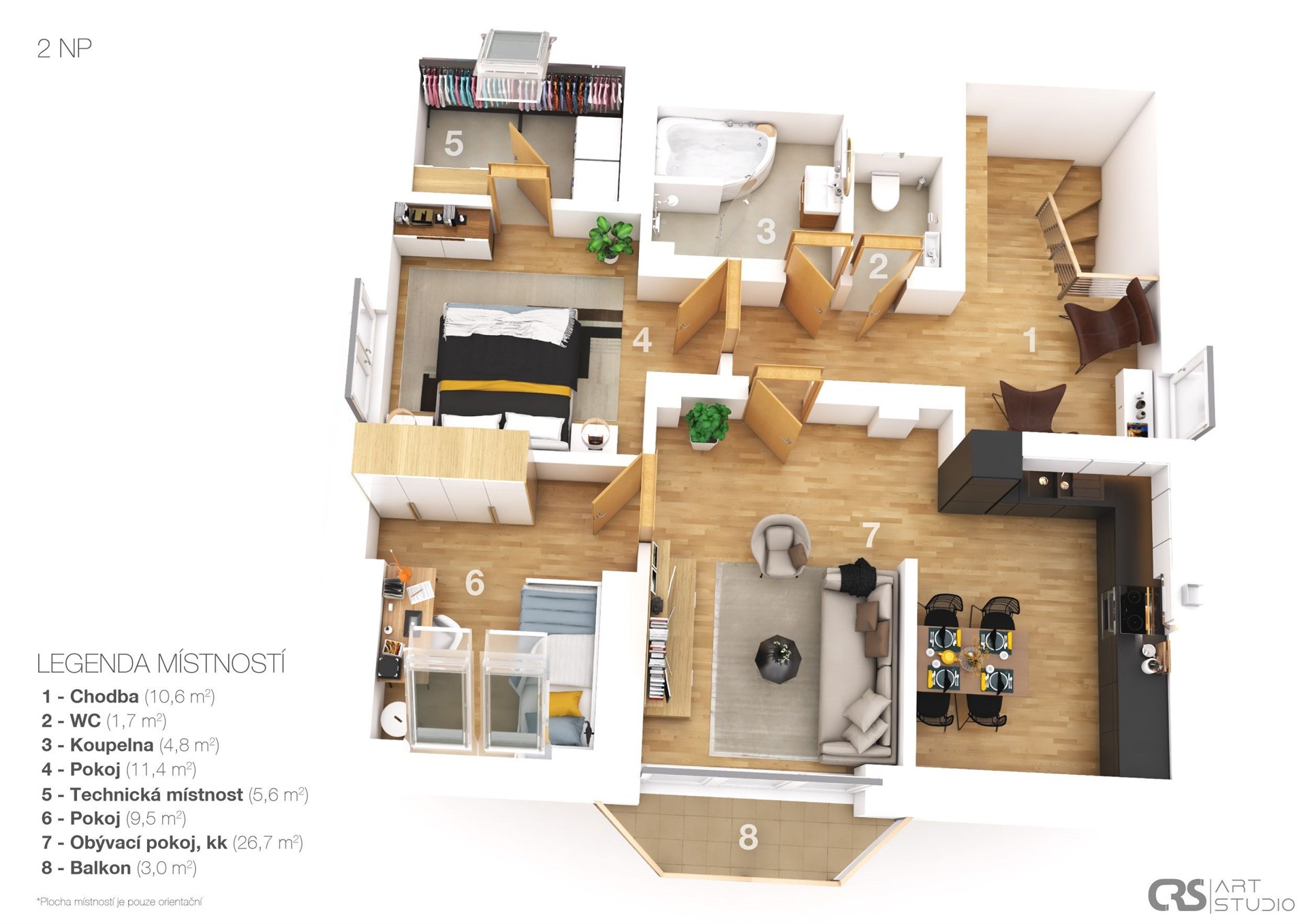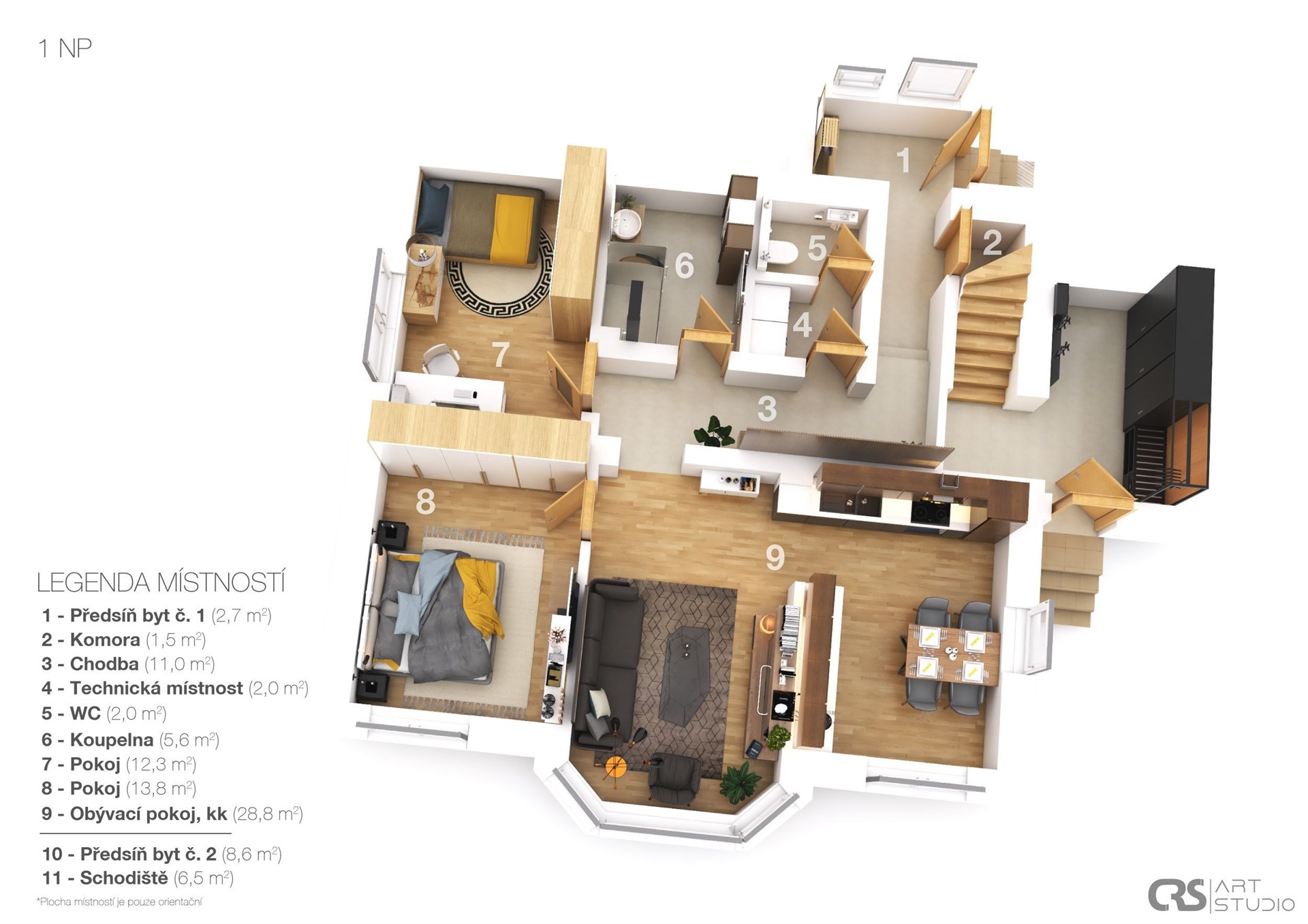 Dům má celkovou obytnou plochu 178 m² a užitkovou plochu 211 m², která je rozložena mezi dvěma nadzemními patry a jedním podzemním podlažím. Dle vytvořené studie a stavebního projektu lze dům přestavět na dvě samostatná bytové jednotky s dispozicí 3+kk, kdy byt ve 2.NP disponuje balkonem a menším podkroví. Obě bytové jednotky budou mít svoje vlastní, oddělené a samostatně přístupné sklepní prostory. Spodní byt v přízemí nabízí potom 78,2 m² užitné plochy a byt ve druhém podlaží potom 87 m². Oba byty počítají s vlastním vstupem, a tedy jsou absolutně na sobě nezávislé. Díky tomu je dům a byty ideální pro rodiny hledající prostor a soukromí. Nicméně lze zachovat aktuální společné prostory a pak může být dům kompletně vícegenerační a nabízet více společných prostor pro rodiny. V současné stavu je dům určen k rekonstrukci, což představuje skvělou příležitost přizpůsobit interiér podle vlastních představ a potřeb, kdy se projekt může změnit dle představ nových majitelů. Po vybudování samostatných bytů lze využít jako investiční příležitost se ziskem z pronájmů.