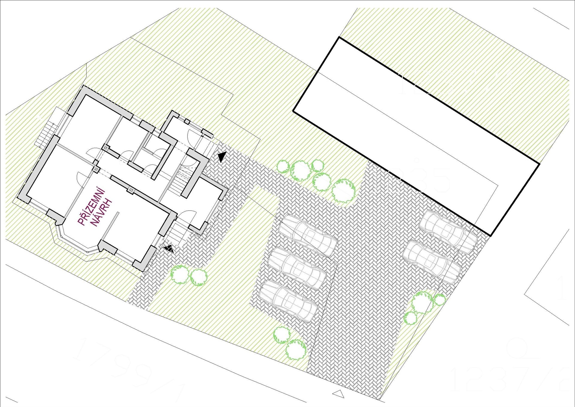 U domu může vzniknout dle studie 5 parkovacích míst na pozemku za bránou. Aktuálně se počítá s využitím pozemku, který je zastavěný hospodářským stavením, a tento po demolici využít na výstavbu druhého rodinného domu. Není to však podmínkou.