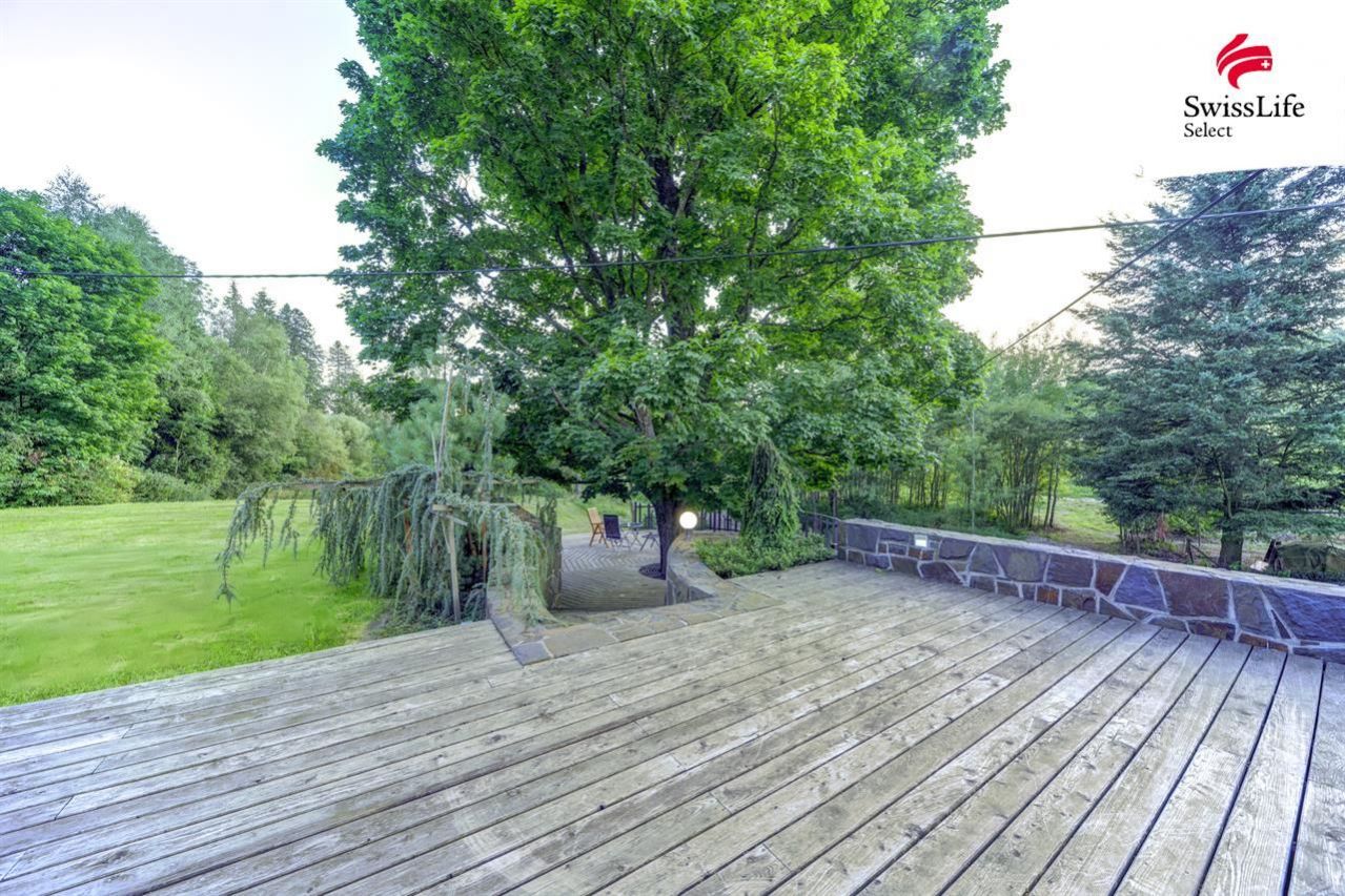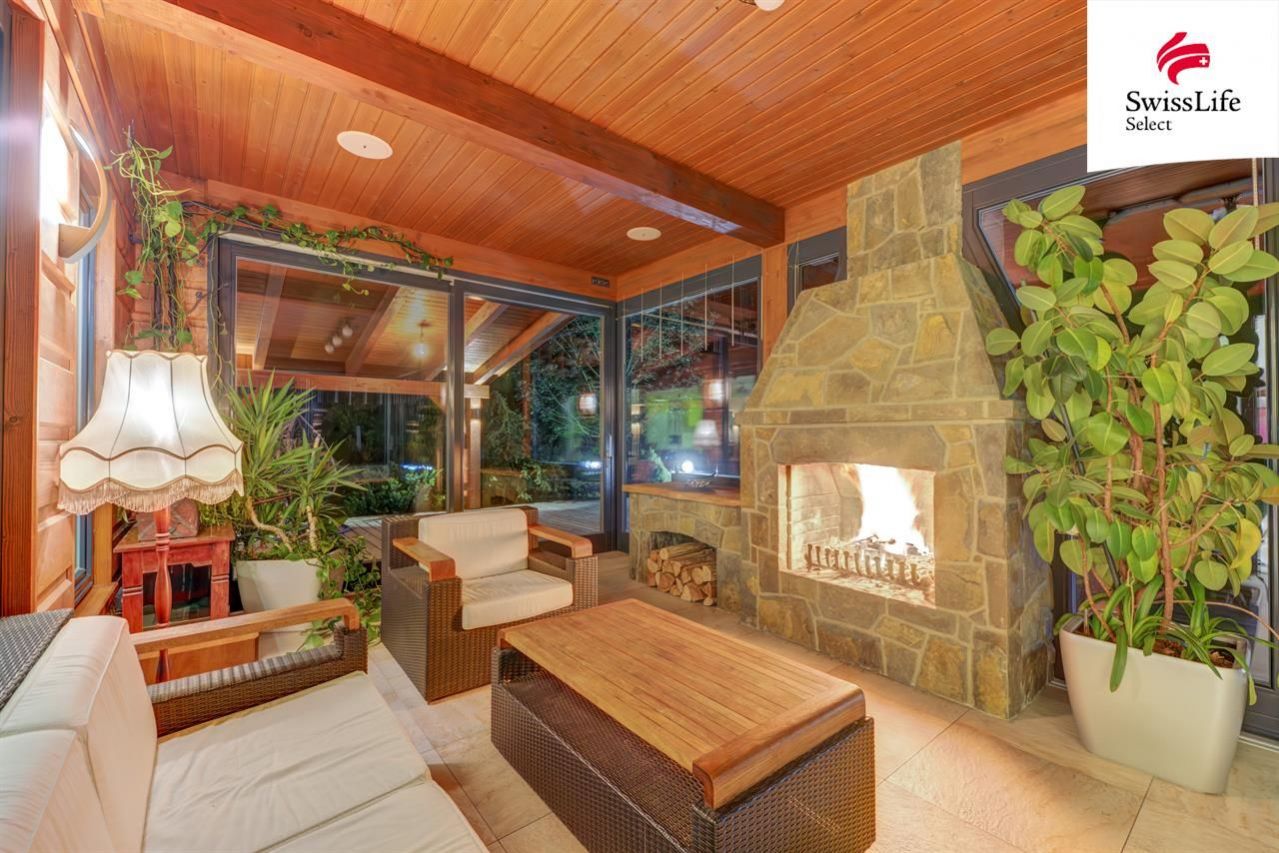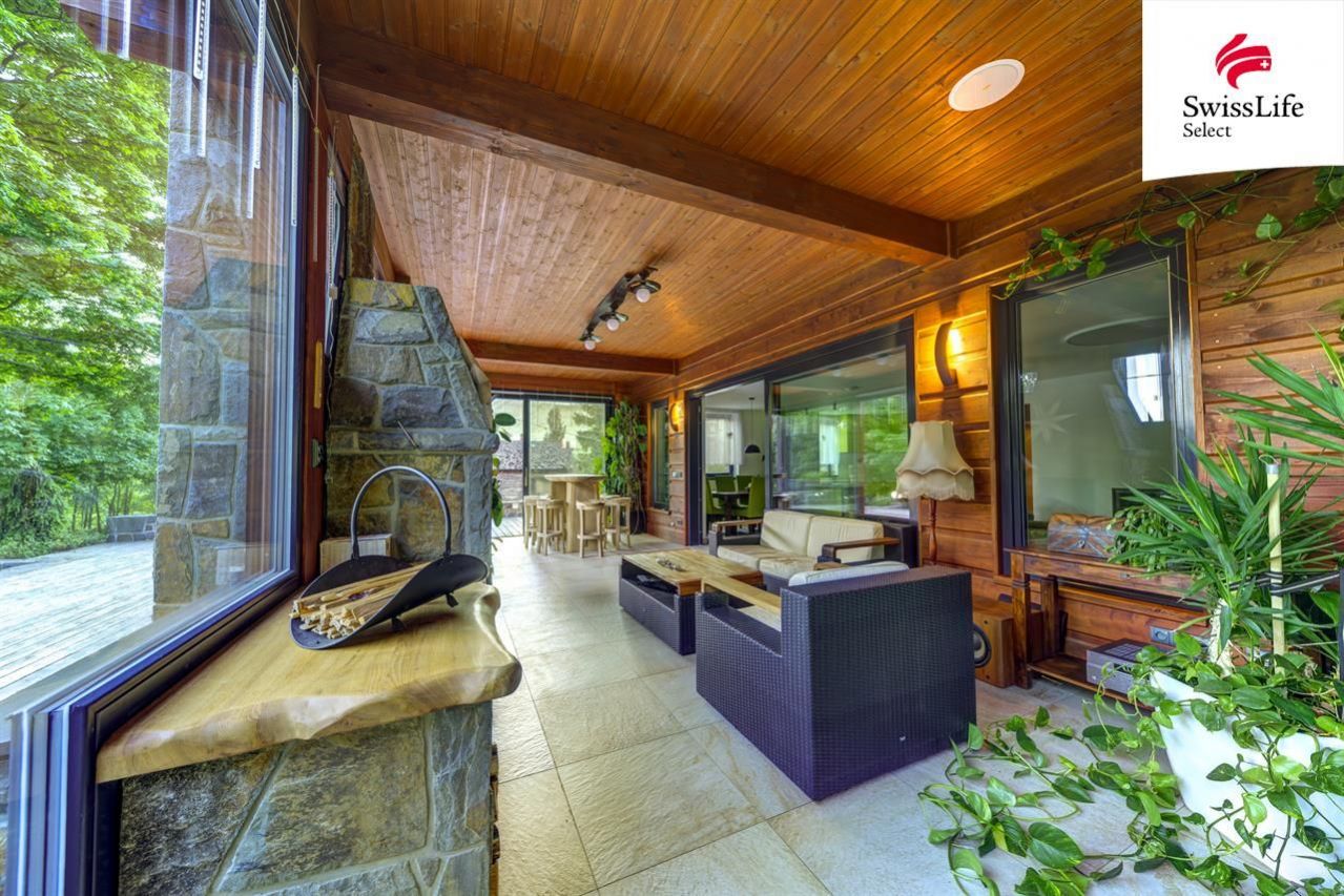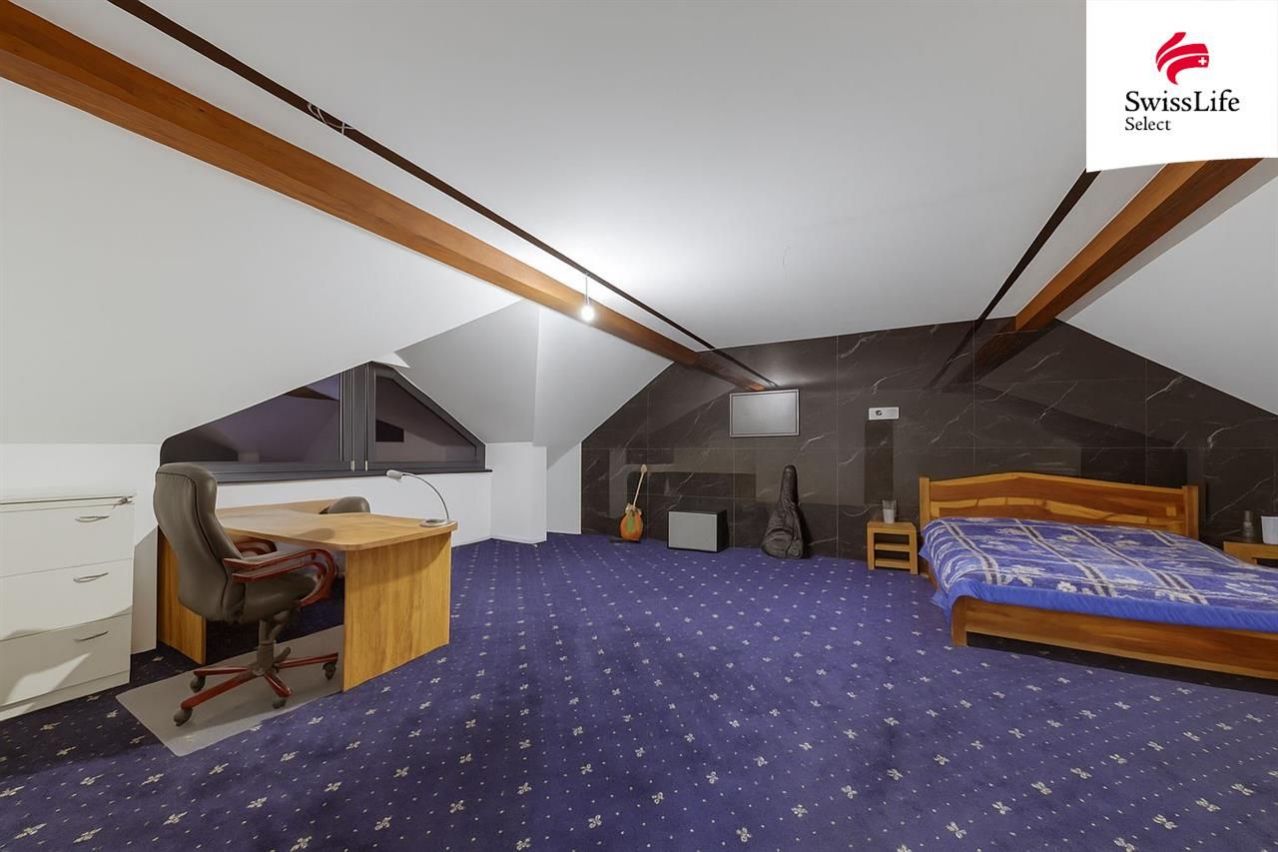 V podkroví rodinného domu se nachází prostorná pracovna, koupelna s wc a relaxační pokoj s finskou saunou. V podkroví lze využít i další prostory, které nyní nejsou dokončené. Majitelé nemovitosti zajímavým způsobem využili vzrostlého javoru na jižní straně domu. Kruhová terasa o ploše 80 m2, která vznikla kolem kmene stromu, nabízí krásný pohled na celou jižní část pozemku a přímo vybízí k relaxaci, odpočinku nebo k posezení s přáteli po náročném pracovním týdnu. Pod pergolou na východní straně domu je k dispozici venkovní kuchyň s posezením. Veškeré obložení exteriéru domu a zídek je z přírodního kamene, na celou stavbu, exteriér i interiér byly použity nadstandartní materiály včetně osvětlovací techniky.