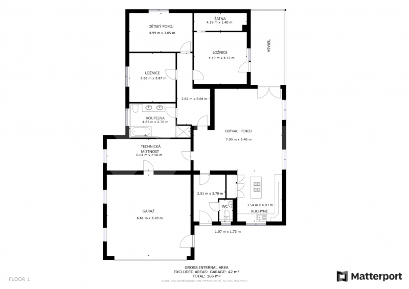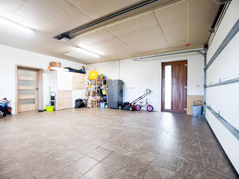 Z předsíně pak do obývacího pokoje a na samostatné WC. Dvougaráž je součástí stavby, do které je vstup přes technickou místnost. V té je umístěna vnitřní jednotka tepelného čerpadla. V garáži je umístěno příslušenství k fotovoltaické elektrárně.