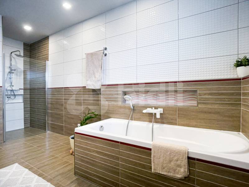 Z chodby je dále vstup do koupelny s dvěma umyvadly, vanou, sprchovým koutem a WC.