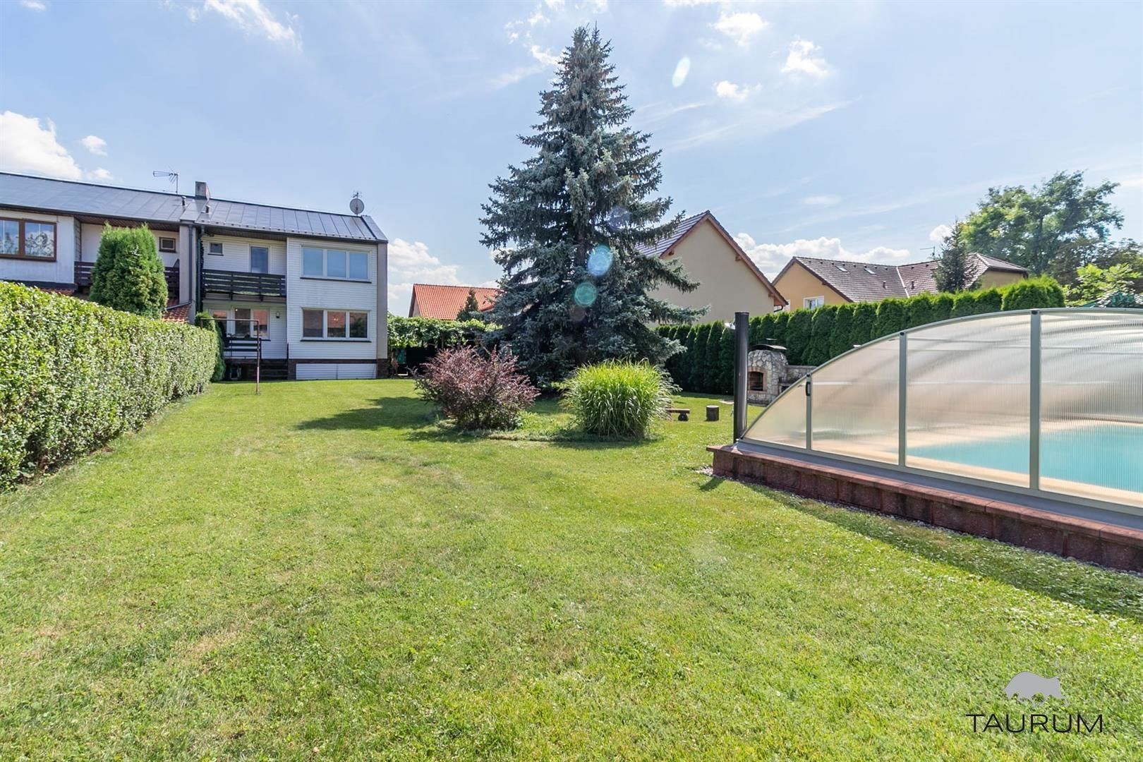 Z kuchyně nebo i přímo z prostoru pro parkovací místa jsou přístupy na krásnou, velkou, rovinatou a udržovanou zahradu, kde je možné posezení jak pod pergolou s krbem, tak na lavičce pod vzrostlým jehličnanem. Najdete tam též plně funkční bazén a zahradní domek, který je rozdělen na obytnou a užitnou část.