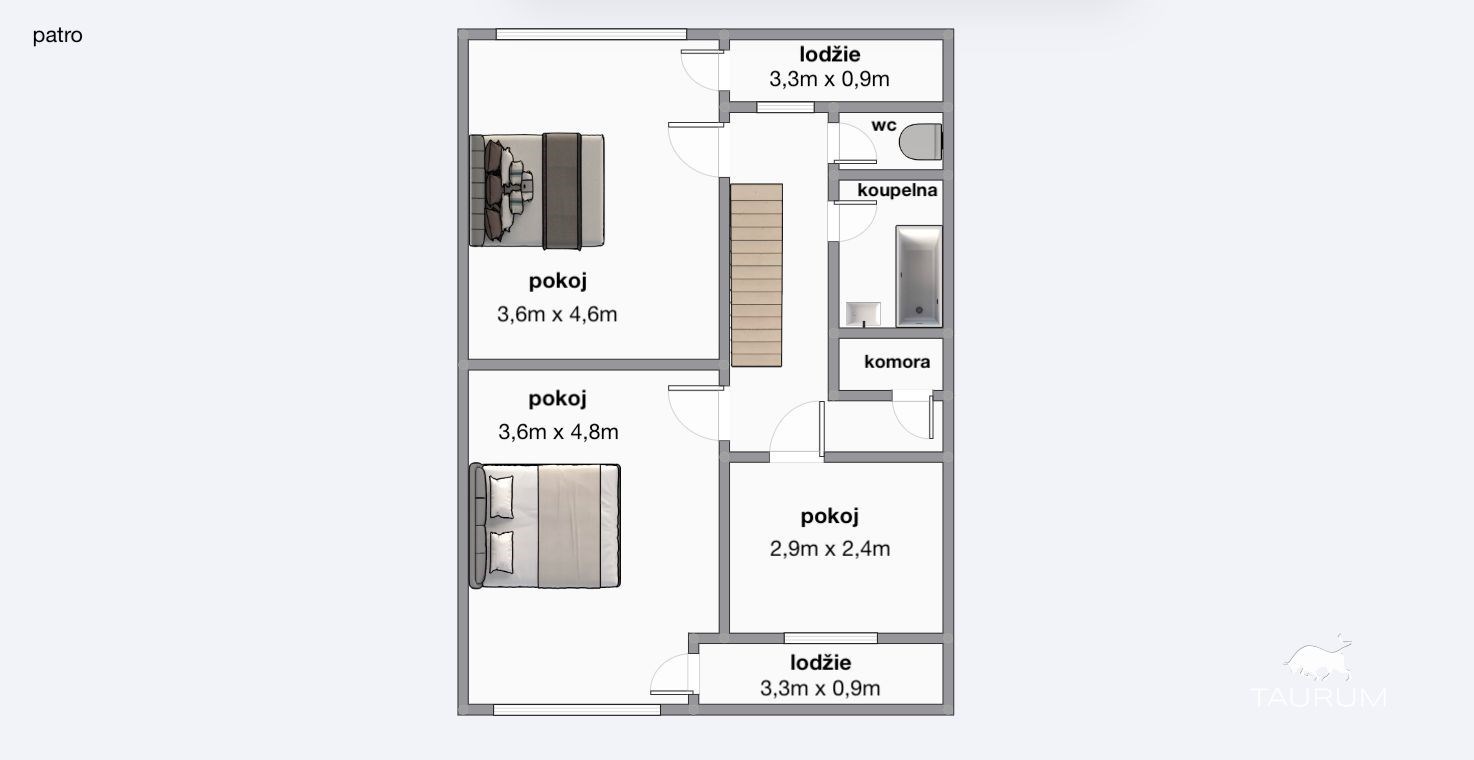 V patře jdou pak další 3 pokoje, samostatné wc, koupelna, komora a vstupní otvor na půdu.