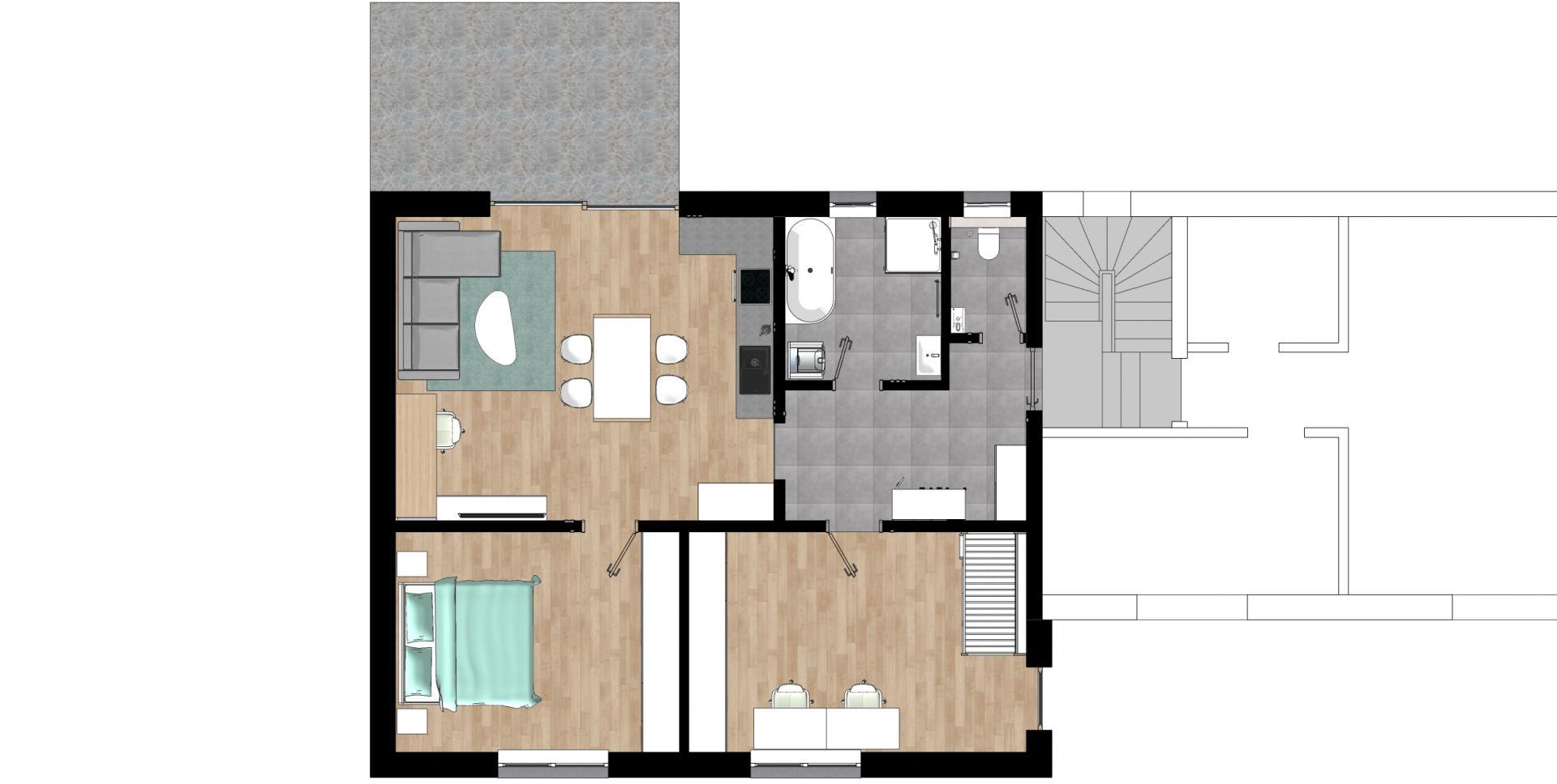 - vytápění - tepelné čerpadlo - podlahové vytápění do systémových desek vč. rozdělovače, v koupelně i topné těleso
