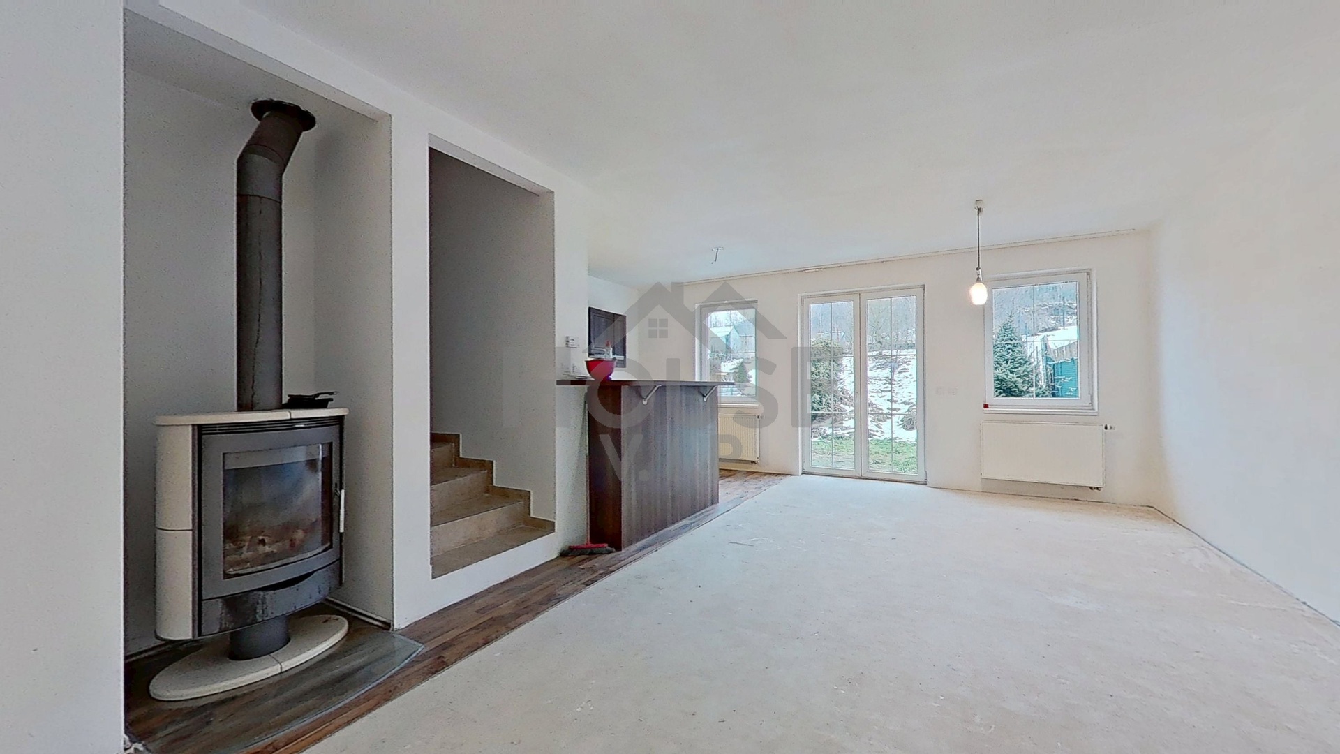 Dispozice domu je prakticky řešena do tří podlaží. V přízemí se nachází vstupní chodba, koupelna, samostatné WC, prostorná komora a technická místnost s nově instalovaným kondenzačním kotlem (2023). Dominantou tohoto podlaží je světlý obývací pokoj s kuchyňským koutem o celkové ploše 48,1 m², kde jsou instalována funkční krbová kamna. Z obývacího pokoje je přímý vstup na zahradu o výměře 127 m². Zahrada je u domu rovná a směrem dozadu přechází do mírného svahu.