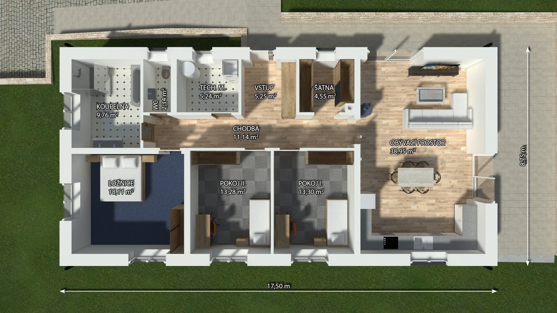 - obývací pokoj s kuchyňským a jídelním koutem s vchodem na terasy domu