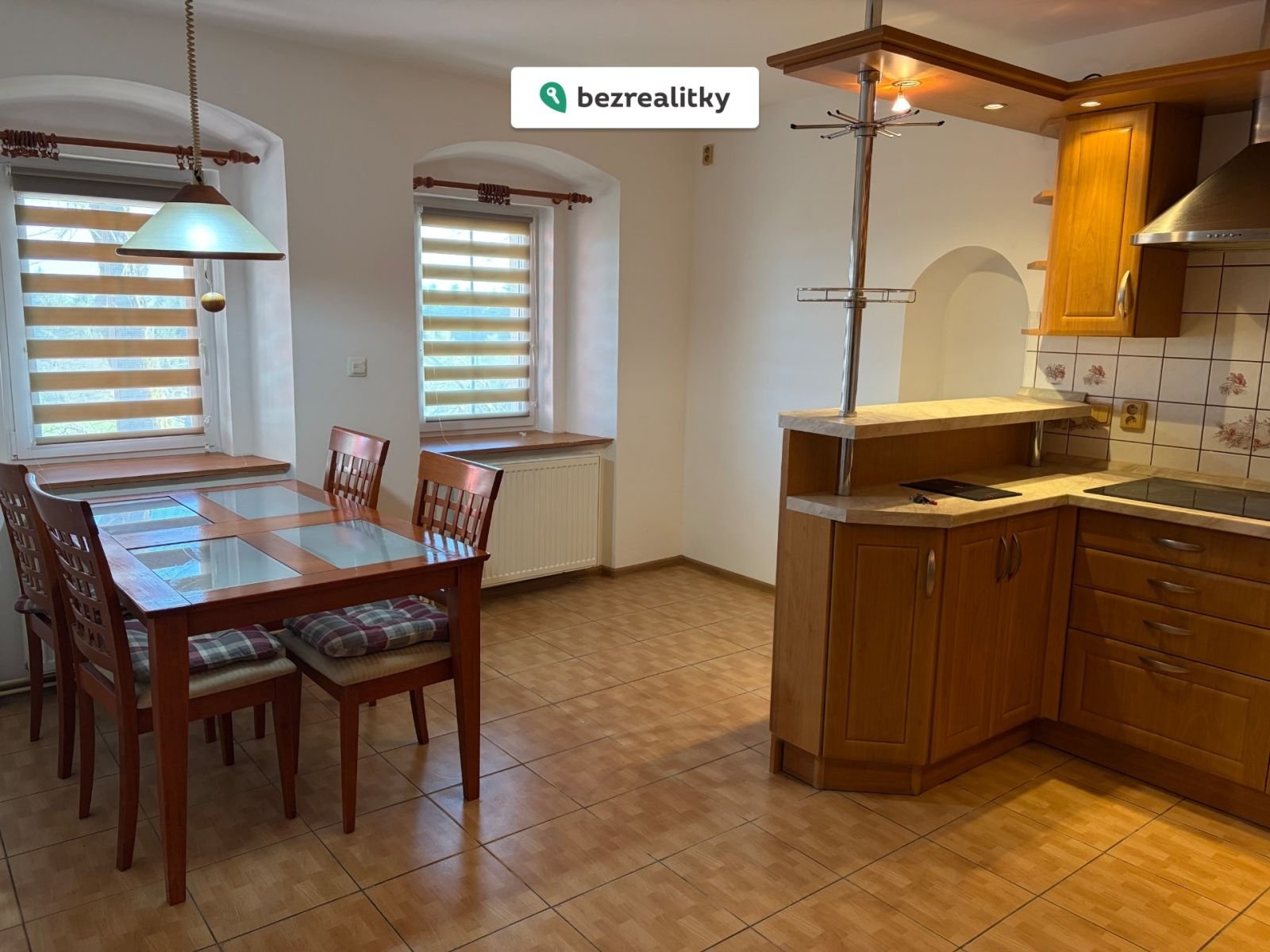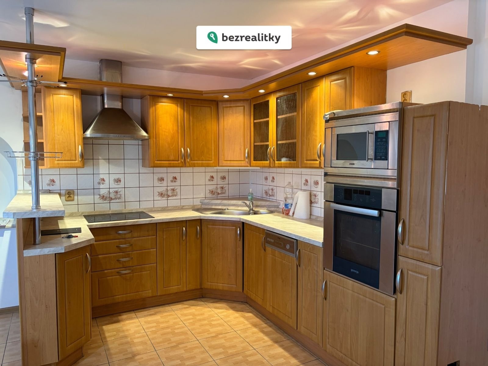 Kuchyně stavěná na míru s dubovými dvířky a vestavěnými spotřebiči Gorenje je plně funkční. Dvě koupelny — v přízemí rohová vana se sprchovým koutem, v patře rohová vana, WC v obou podlažích.