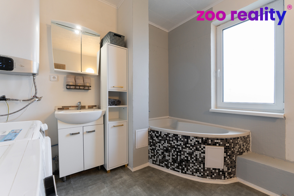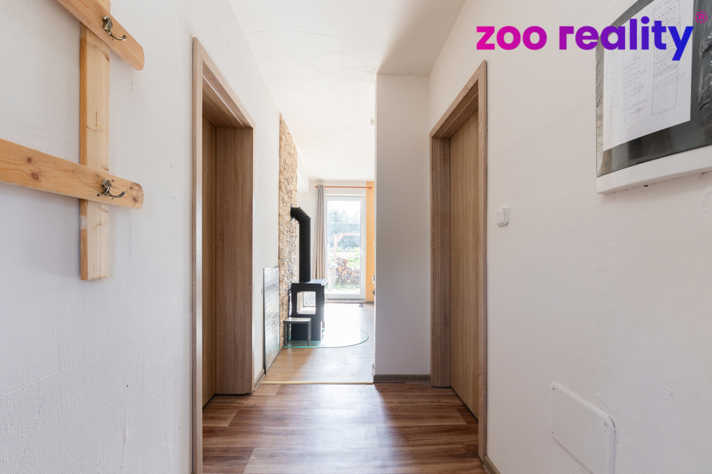 V přízemí najdeme vstupní předsíň, ložnici, koupelnu s toaletou, rohovou vanou a dostatečným prostorem pro pračku a sušičku, dále pak obývací pokoj spojený s kuchyňským koutem a vstupem na zahradu, který je ideální pro rodinné posezení a trávení volného času. V patře pak je myšleno na další koupelnu, kterou si můžete obložit dle vlastního vkusu (nabízíme foto s vizualizací) a dále jsou tu dva samostatné pokoje. Vytápění domu je řešeno elektrickými panely a krbovými kamny na dřevo s výměníkem, které zajistí příjemné teplo během chladných měsíců, ohřev vody řešen elektrickým bojlerem. O odpadní vodu se postará samostatná čistička.