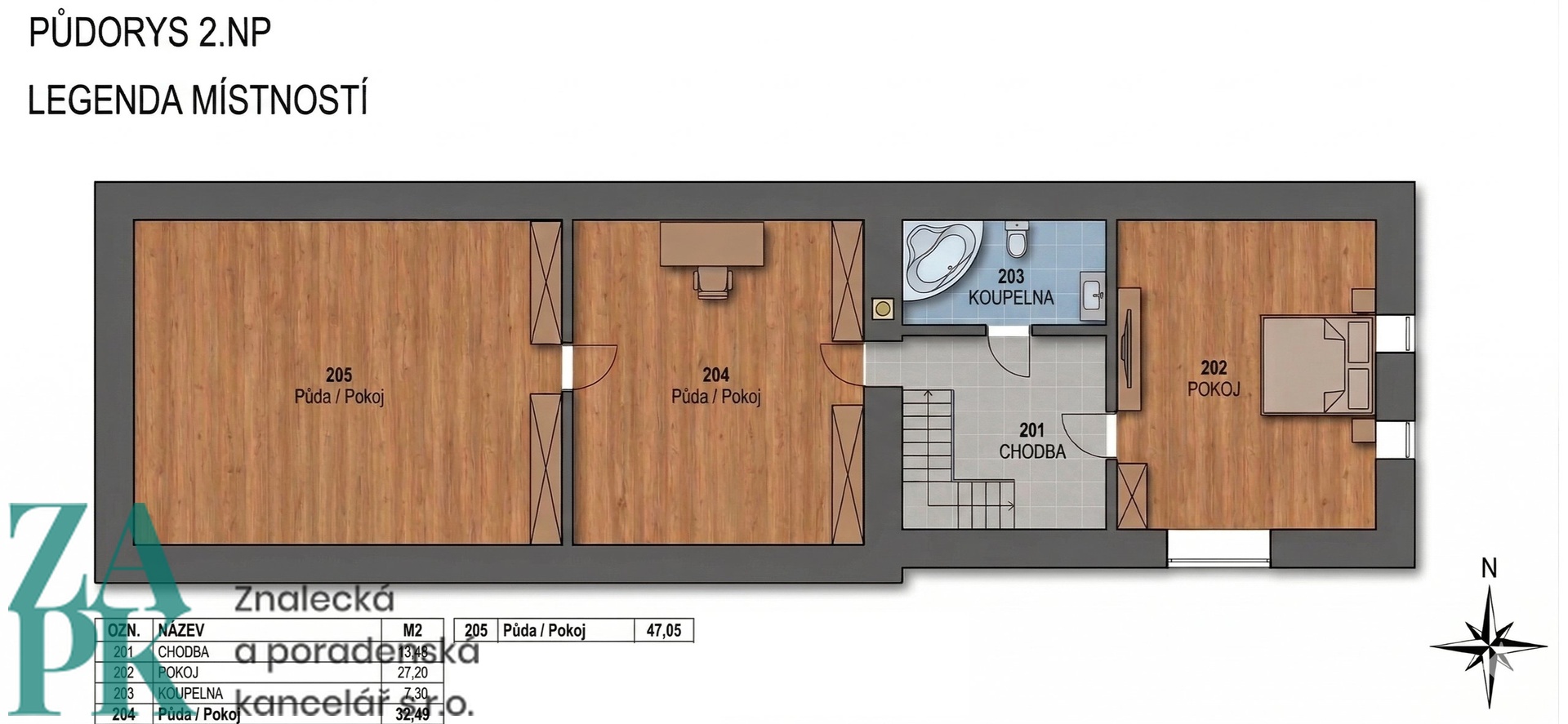 - Podkroví 127,47 m²: Klidová zóna zahrnující ložnici, koupelnu s WC, halu a další půdní prostory s potenciálem využití.