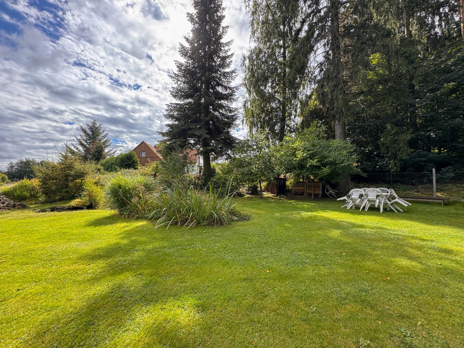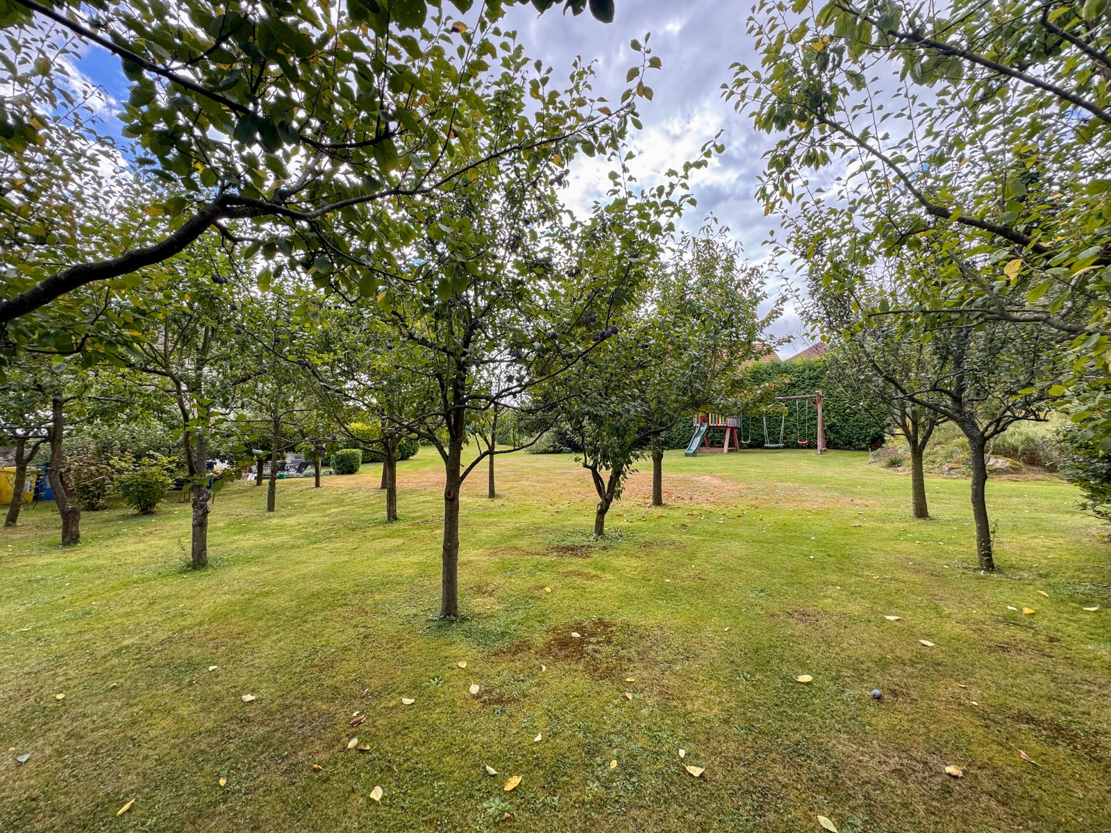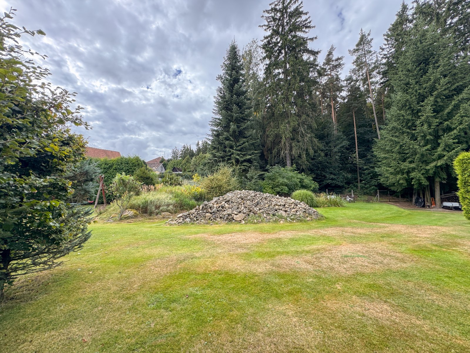 • ovocný sad, okrasná zeleň, zahradní jezírko, terasa se zahradním posezením a dětské hřiště
