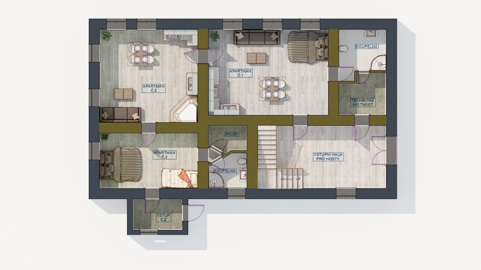 Dům se již více než 20 let úspěšně pronajímá a disponuje stabilní klientelou. Díky své poloze, kapacitě a technickému stavu je ideální volbou jak pro investici s okamžitým výnosem, tak pro vlastní rekreační využití. V přízemí se nachází dva bezbariérové apartmány.