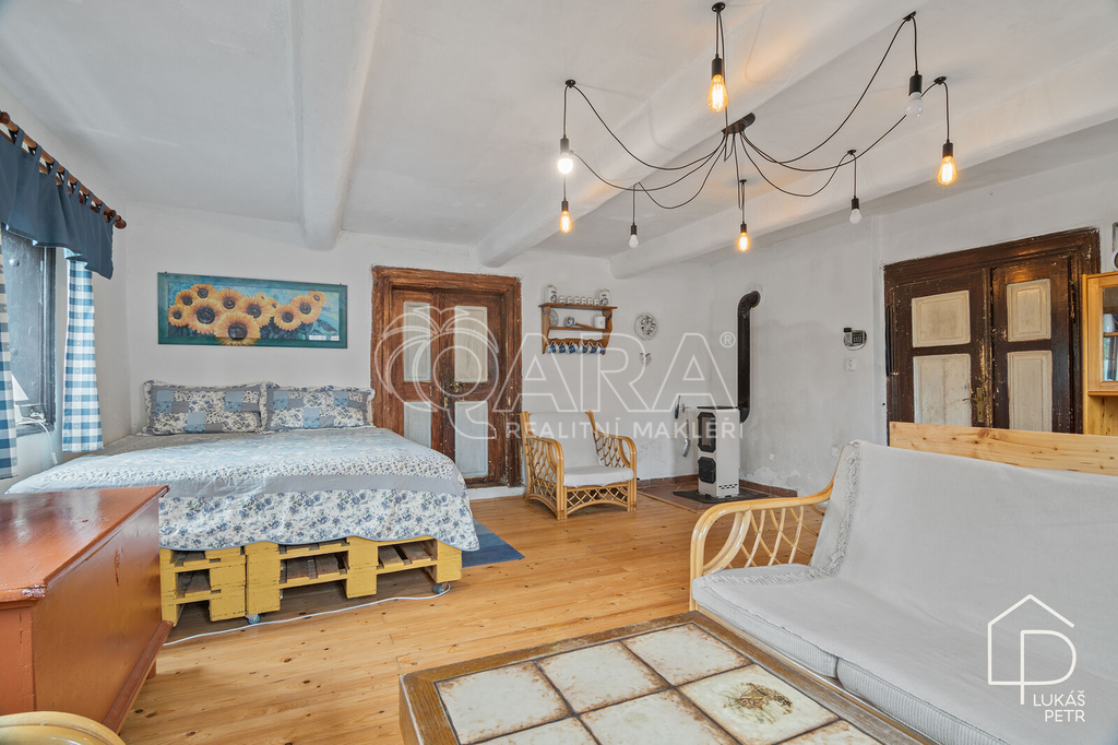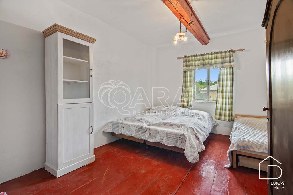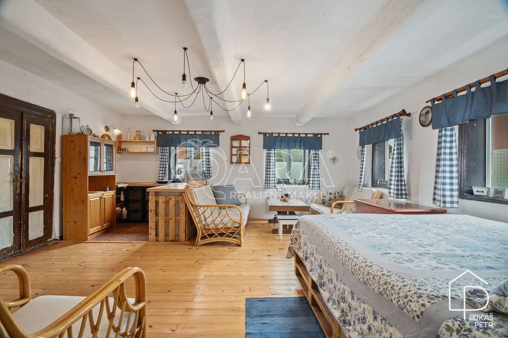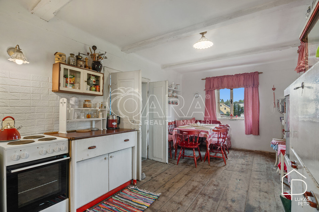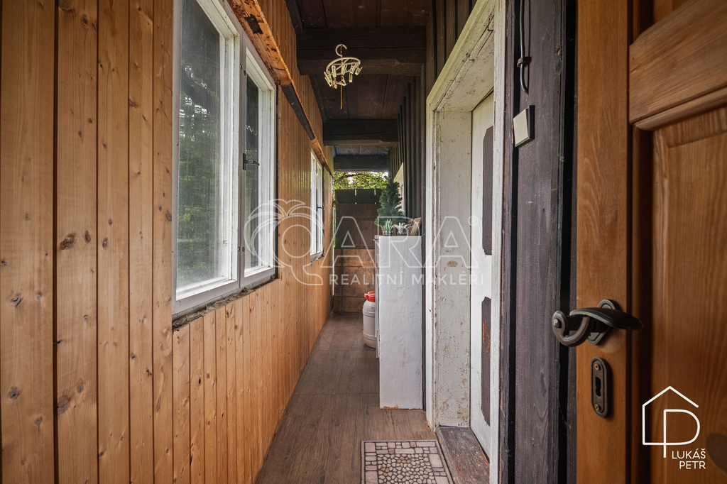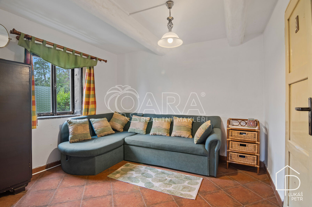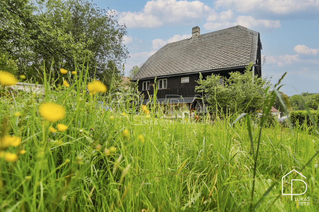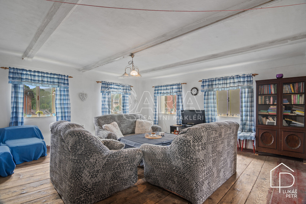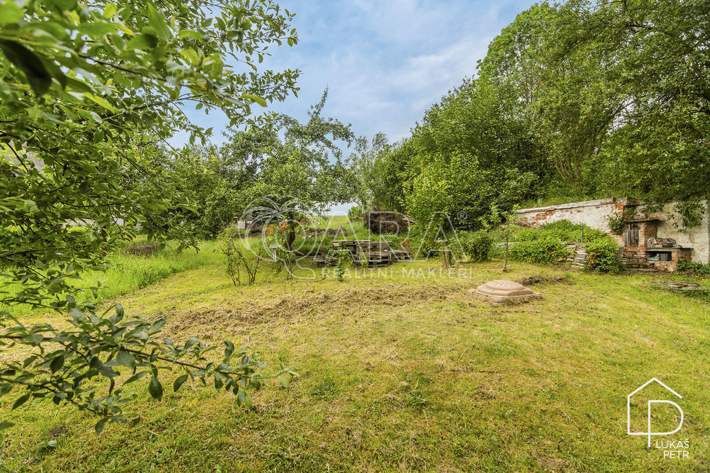 Chalupa stojí na pozemku s výměrou 720 m2 a nabízí dispozici 6+1.