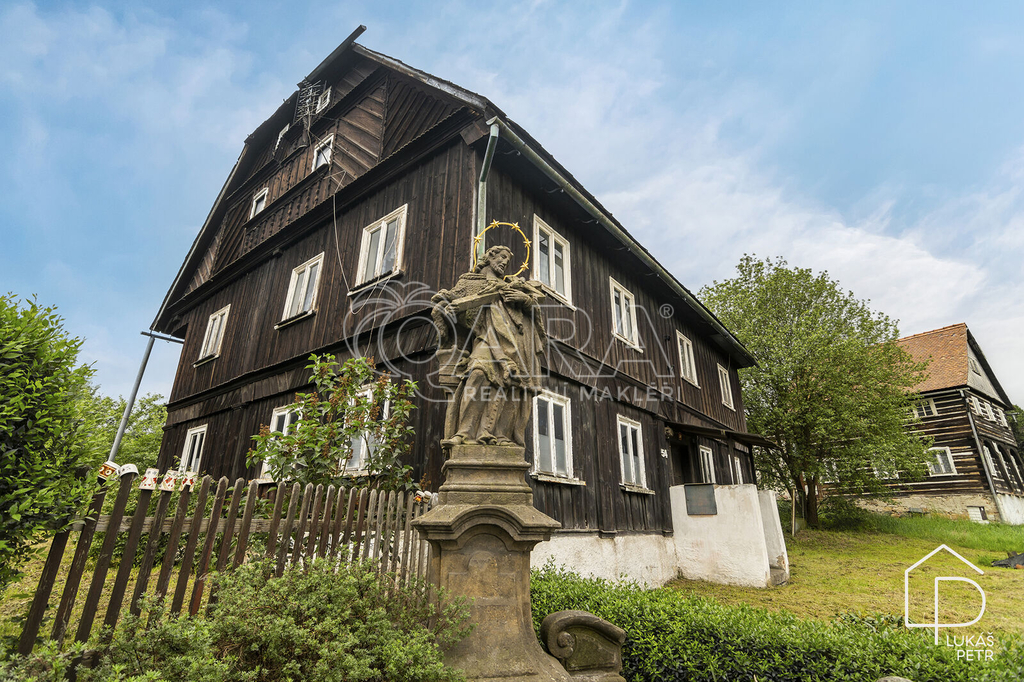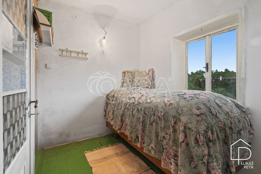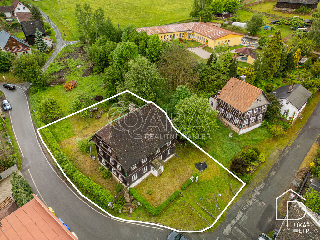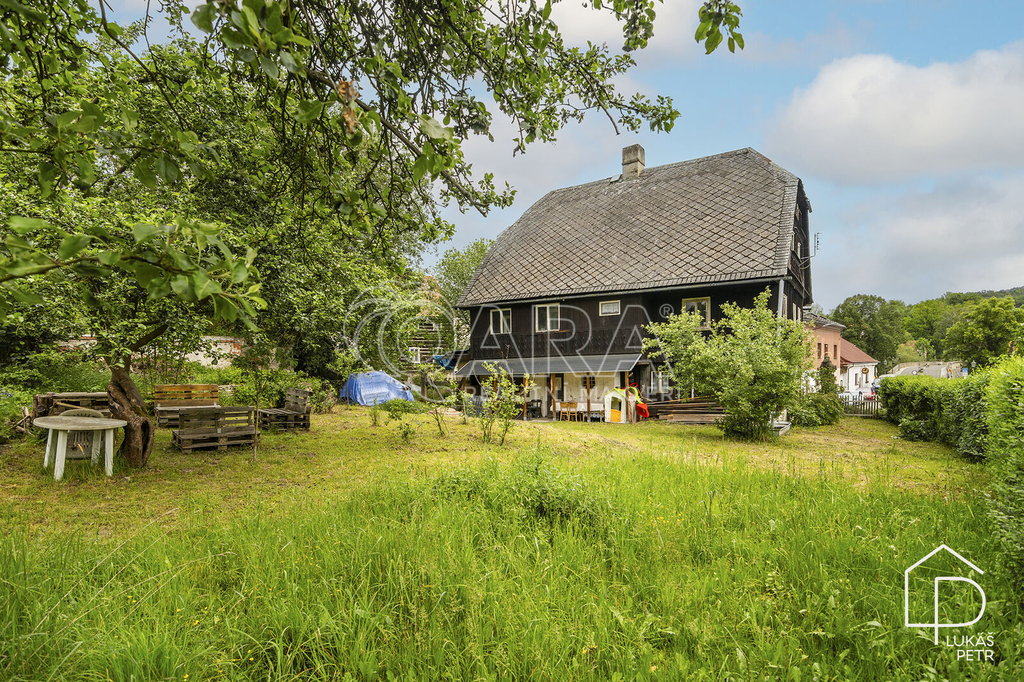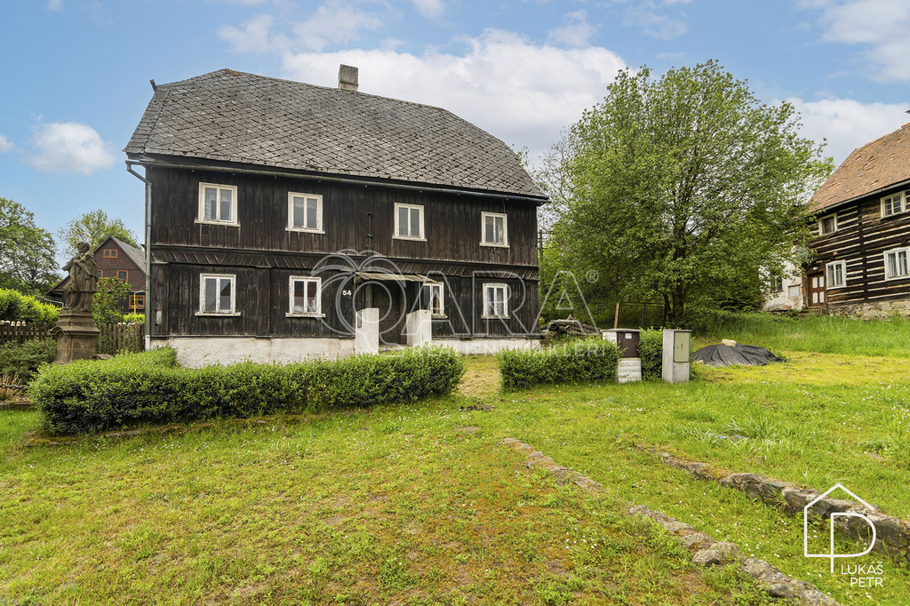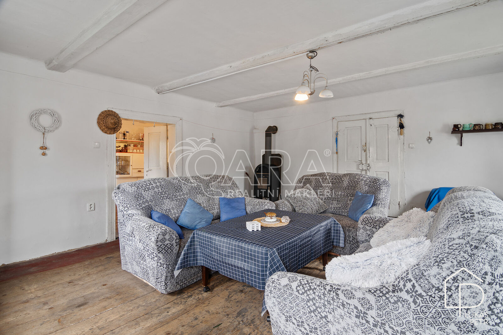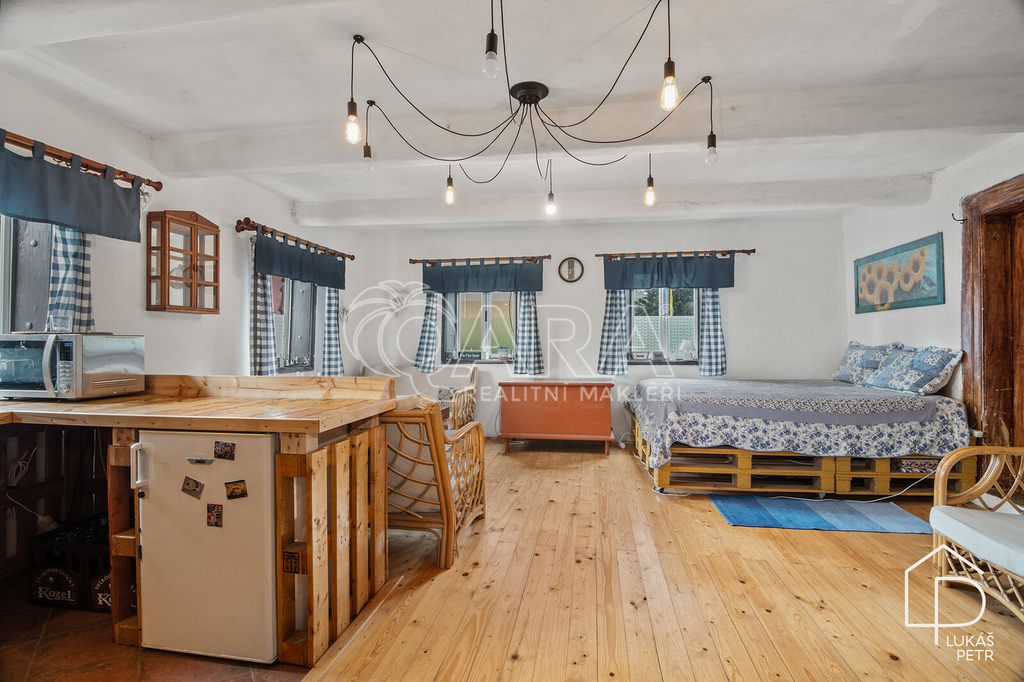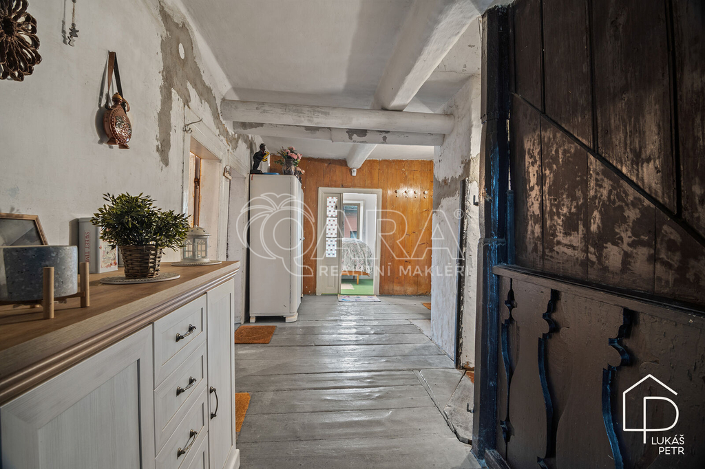 Chalupa stojí na pozemku s výměrou 720 m2 a nabízí dispozici 6+1.